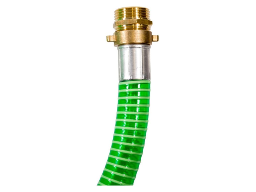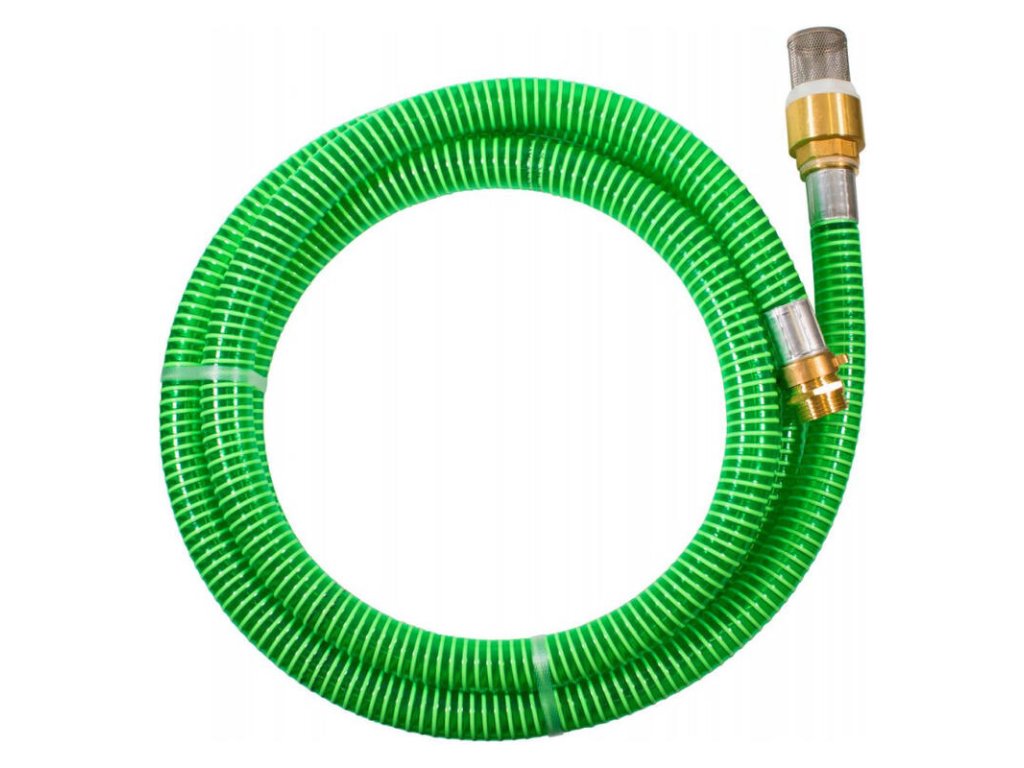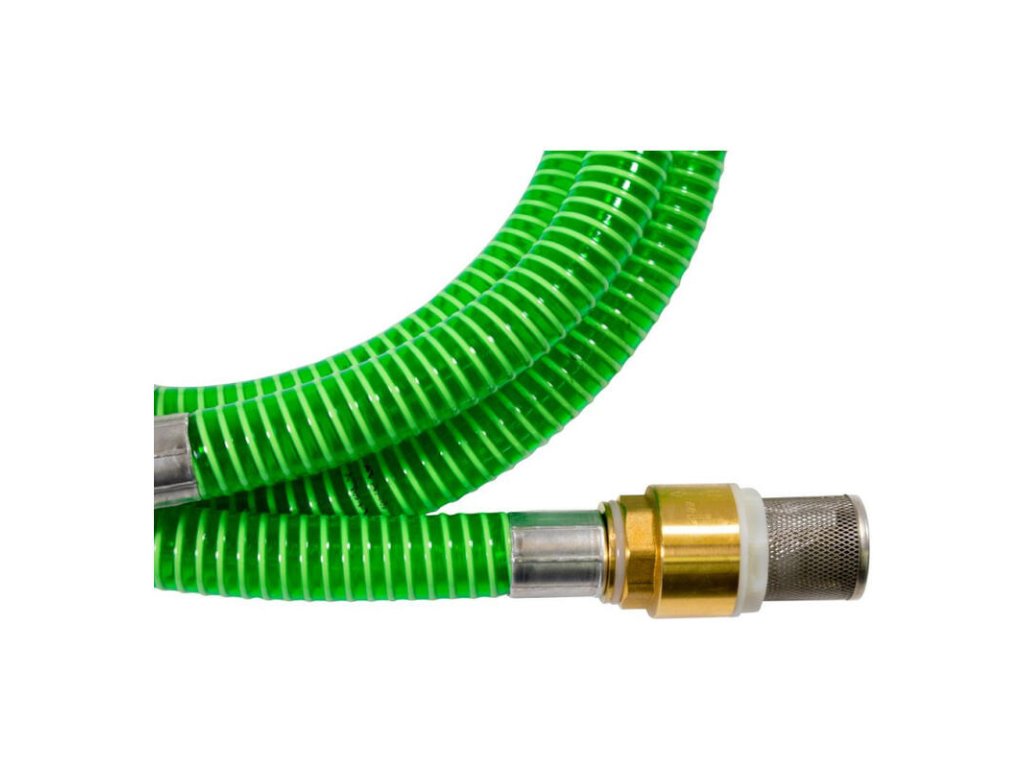 Špirálová sacia garnitúra s mosadznými armatúrami, mosadzným ventilom so sacím košom z ušľachtilej ocele, zalisované koncovky. S prípojkou Vario pre vonkajší a vnútorný závit.