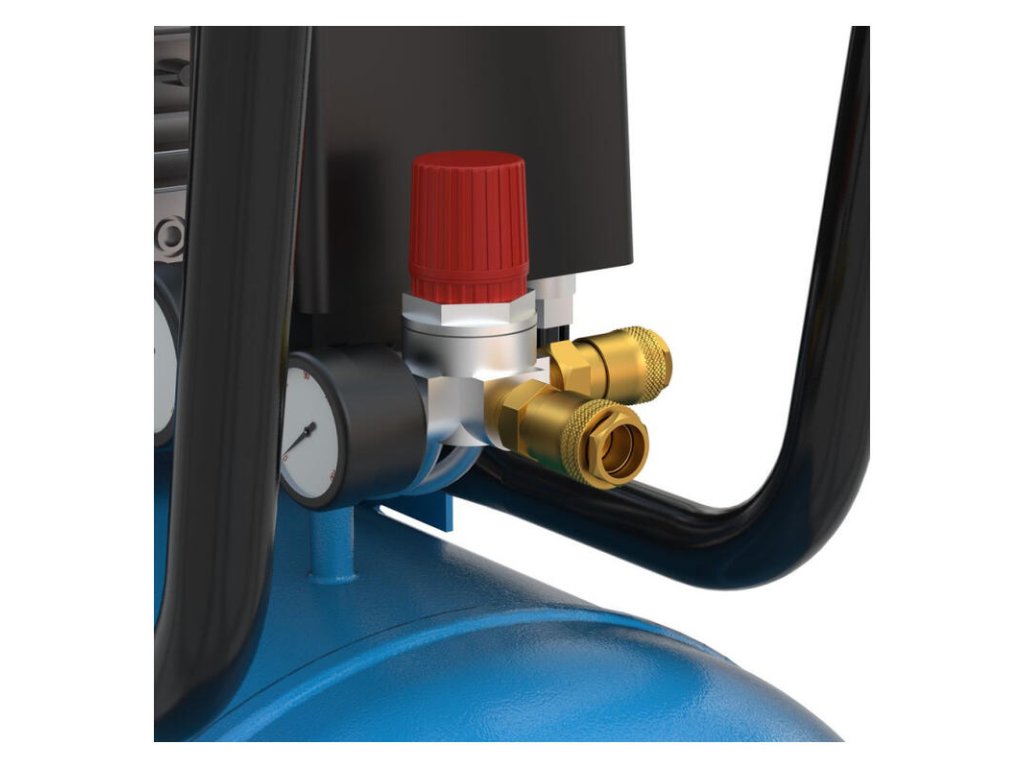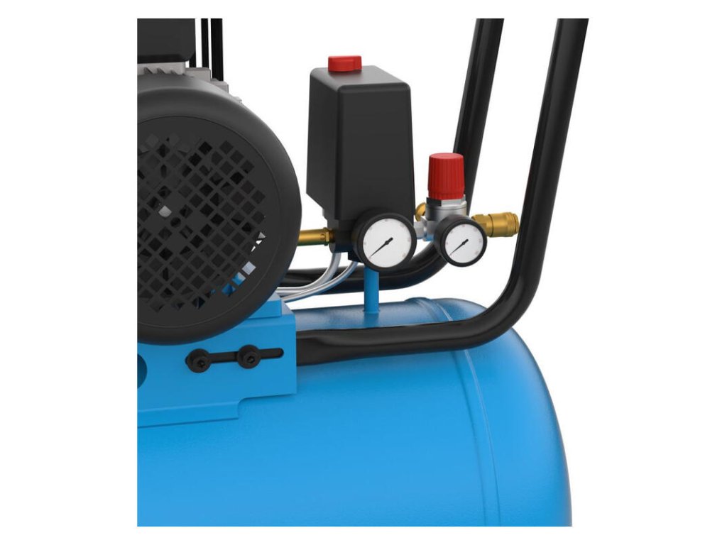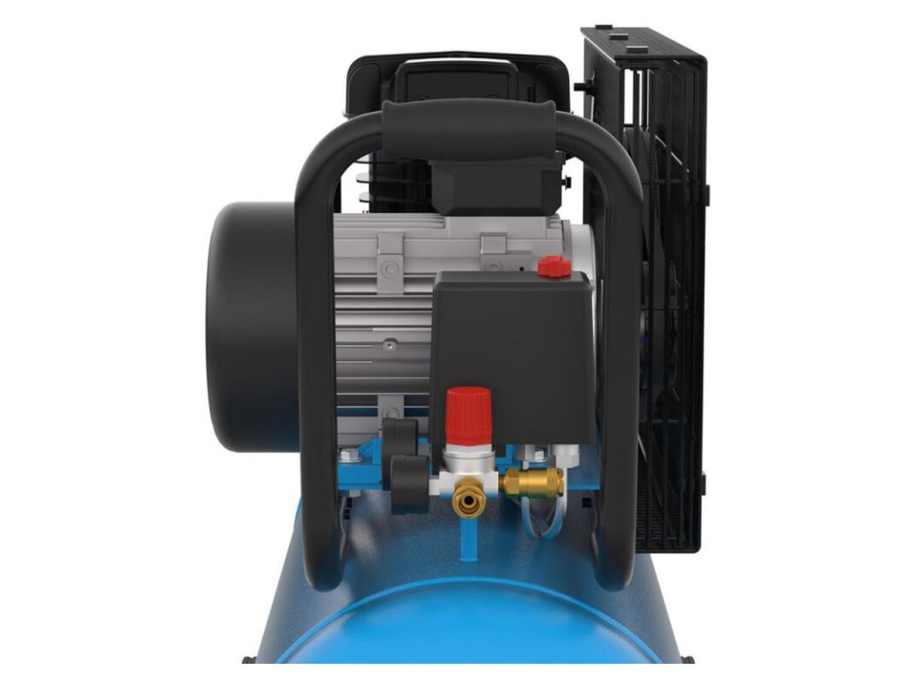 - Dvojvalcový kompresor s olejovým mazaním, remeňovým pohonom, rukoväťou na prenášanie, tlakovým spínačom, dvomi manometrami (manometer na meranie tlaku v nádobe a pracovného tlaku), dvoma pneumatickými spojkami, chladičom plniaceho vzduchu.