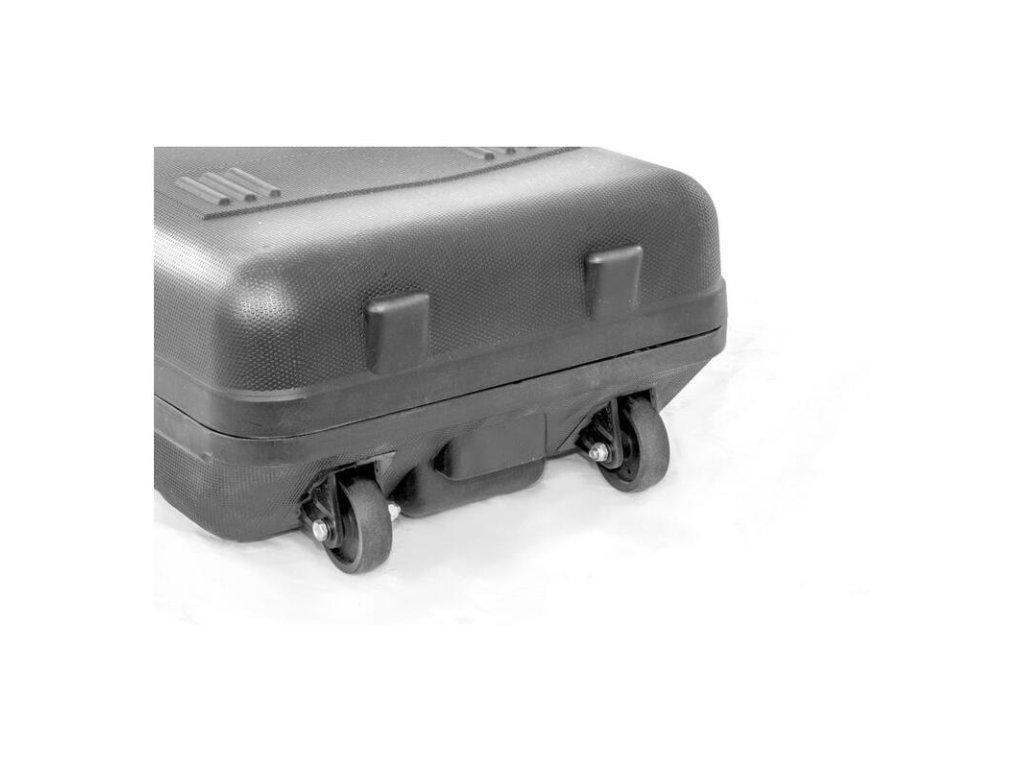 Prepravný kufor s kovovými sponami a kolieskami.