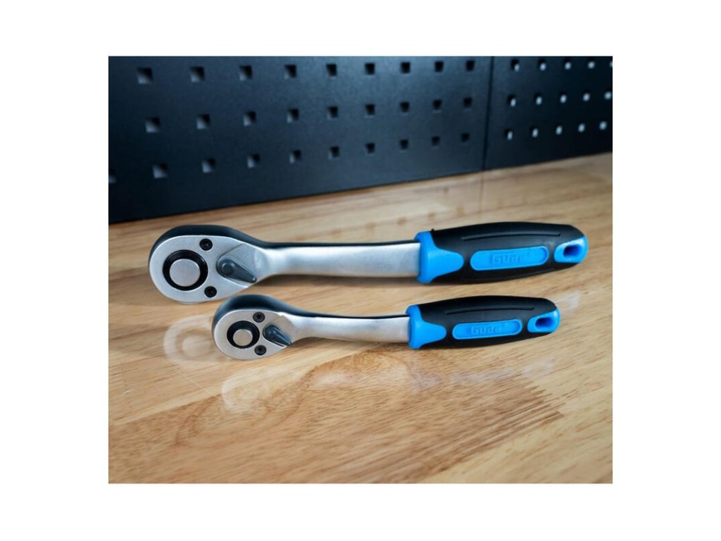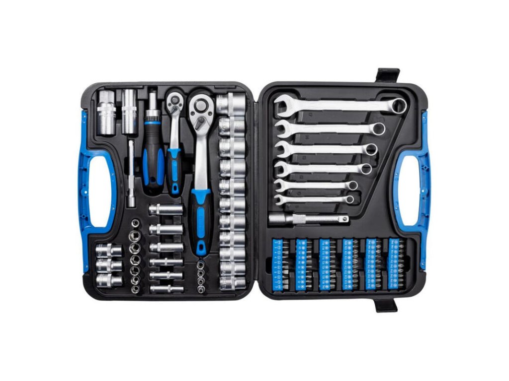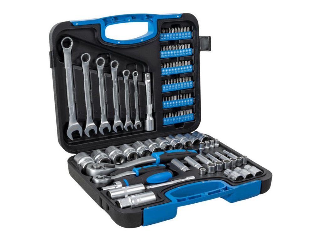 Sada náradia z chróm-vanádiovej ocele v praktickom plastovom kufríku zahŕňa 2 račne (1/2" a 1/4" so 72 zubami) s predĺženiami a nástrčkovými kľúčmi, široký sortiment bitov, bitový skrutkovač s račňovou funkciou a potrebné adaptéry, očko-vidlicové kľúče.