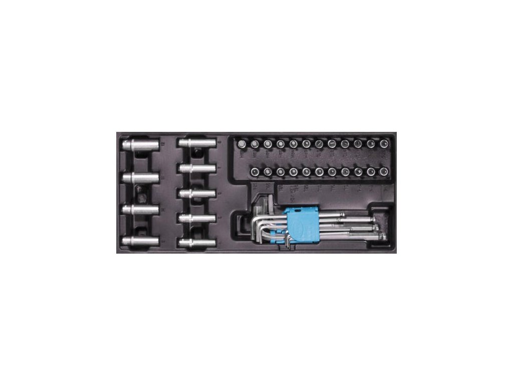 Imbusové kľúče na skrutky s vnútorným šesťhranom s guľovou hlavou na dlhom konci vo veľkostiach: 1.5, 2, 2.2, 3, 4, 5, 6, 8, 10 mm, nástrčné kľúče dlhé s upínaním 1/4" vo veľkostiach: 4, 5, 6, 7, 8, 9, 10, 11, 12 mm. Nástrčné kľúče s upínaním 1/4" vo veľkostiach T8, T10, T15, T20, T25, T30, T40 / H3, H4, H5, H6, H7, H8 / PH1, PH2, PH3 / PZ1, PZ2, PZ3 / SL3, SL4, SL5, SL6. V plastovej vložke do zásuvky.