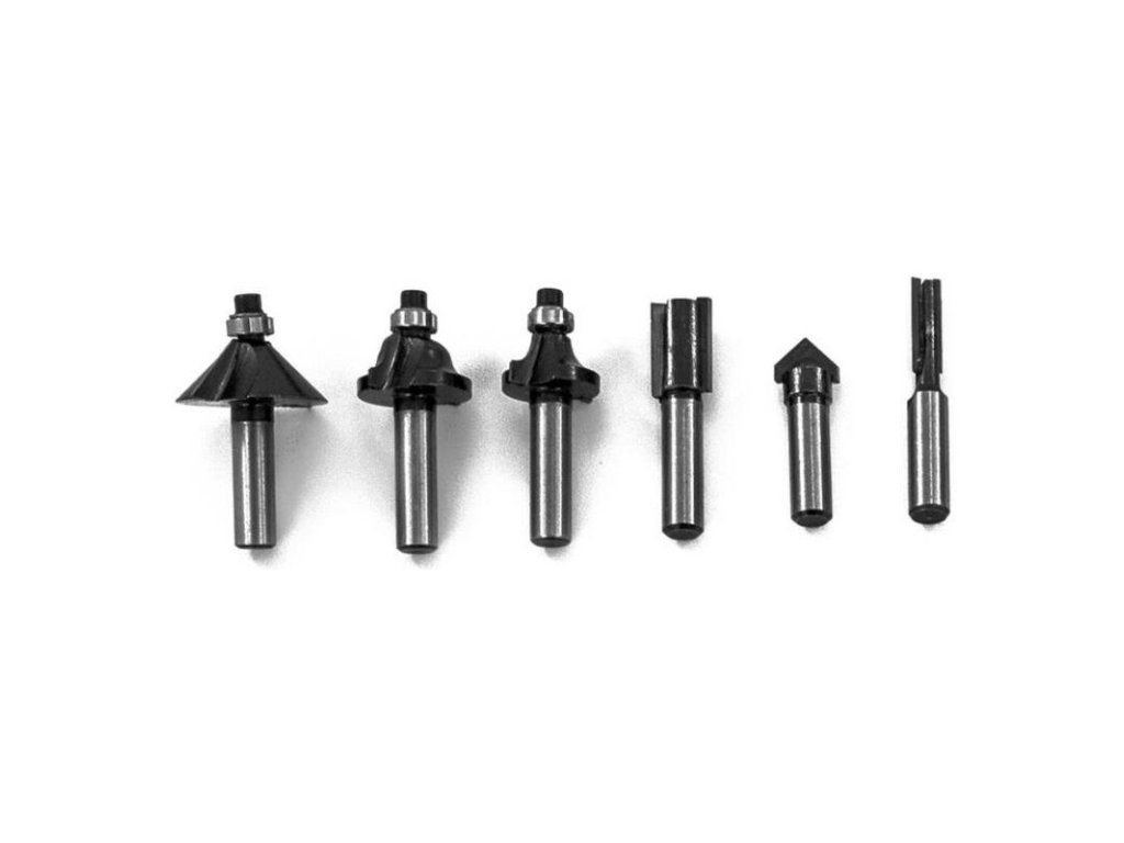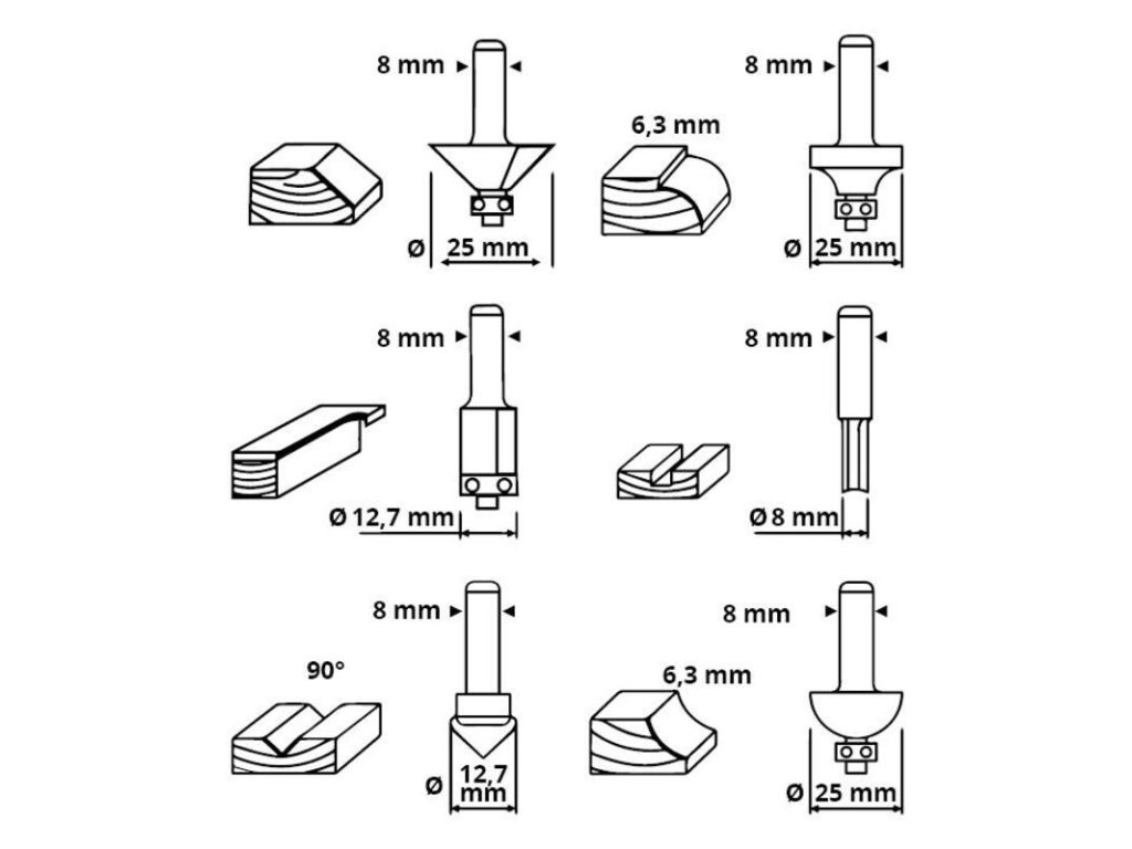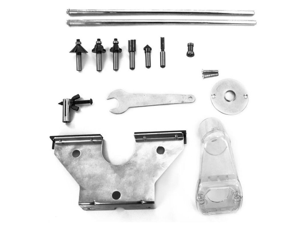 - Prípojka pre prídavný odsávací systém, paralelný doraz, klieštiny (6/8 mm), kružidlo, kopírovacia objímka, kľúč, 6 frézok.