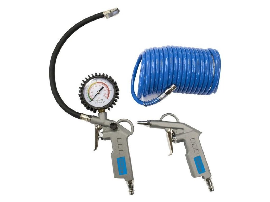 - 3-dielna sada najčastejšie používaného pneumatického náradia/príslušenstva (hustilka pneumatík, krátka vyfukovacia pištoľ a 5 m špirálová PU hadica).