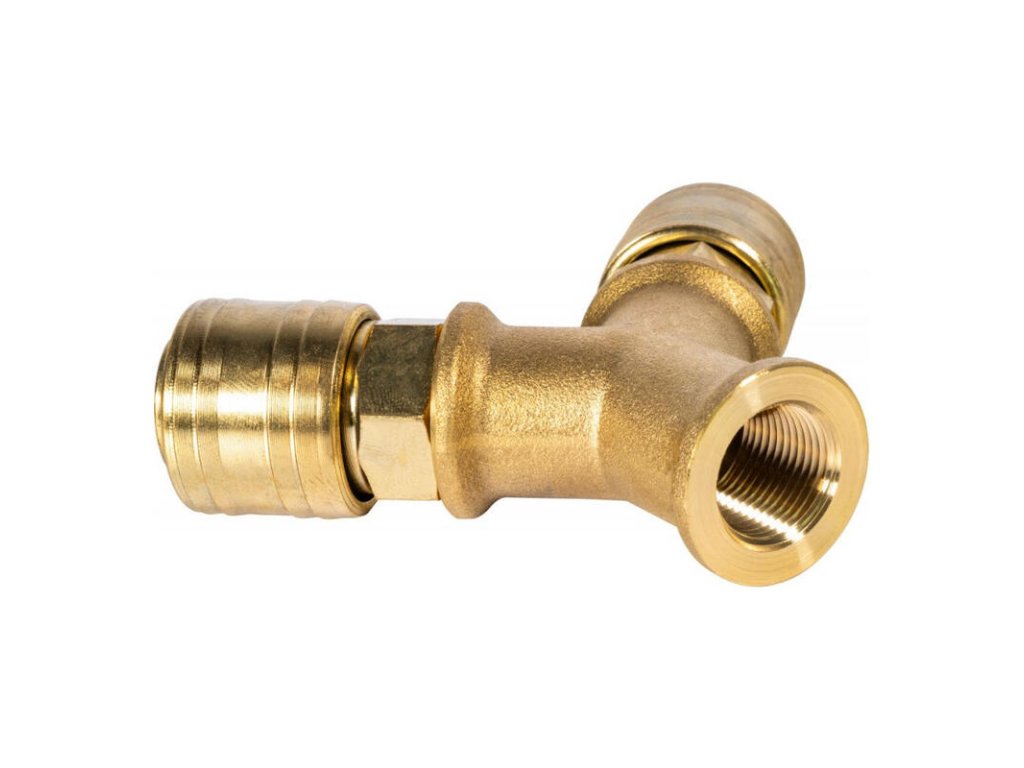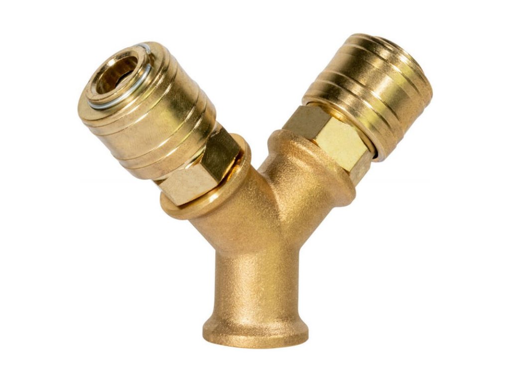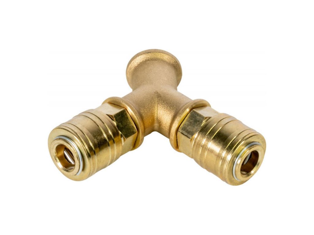Mosadzný rozdeľovač s dvoma spojkami. V balení 1 ks.