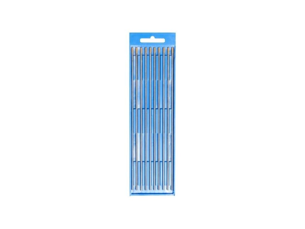 Univerzálna volfrámová elektróda zlatej farby s rozmermi 2,4 mm x 175 mm. S dlhou životnosťou, na plynulý a rovnomerný elektrický oblúk. DIN ISO 6848, nie je rádioaktívna, použiteľná na všetky materiály pri zváraní jednosmerným aj striedavým prúdom. Obsah balenia 10 ks.