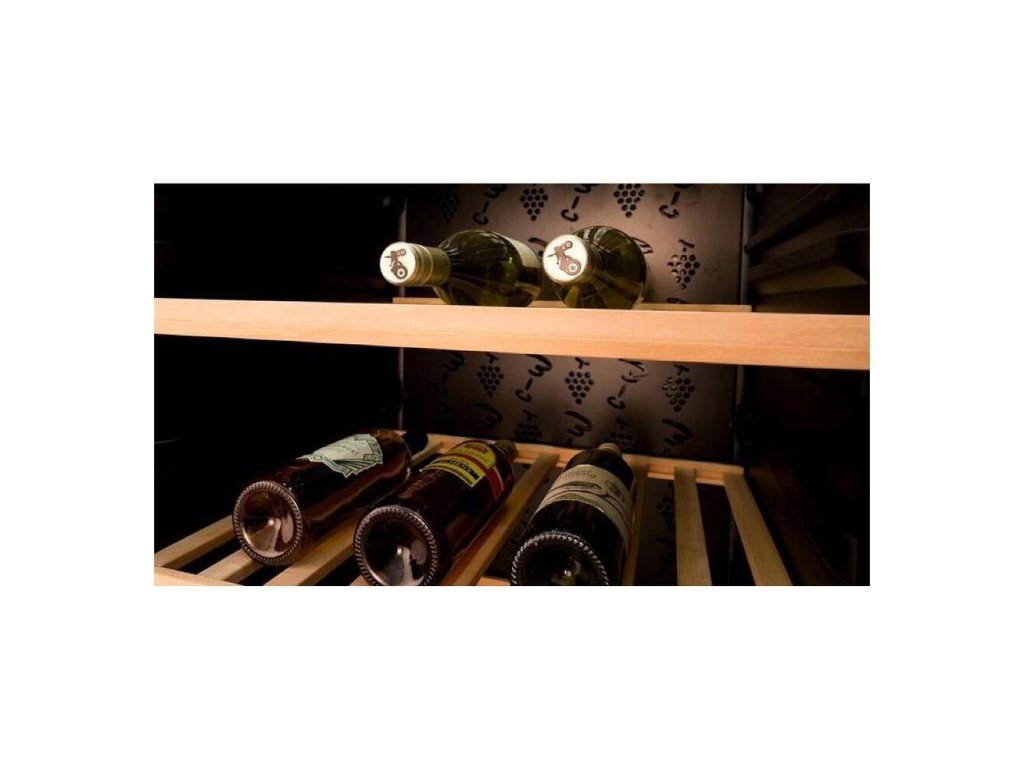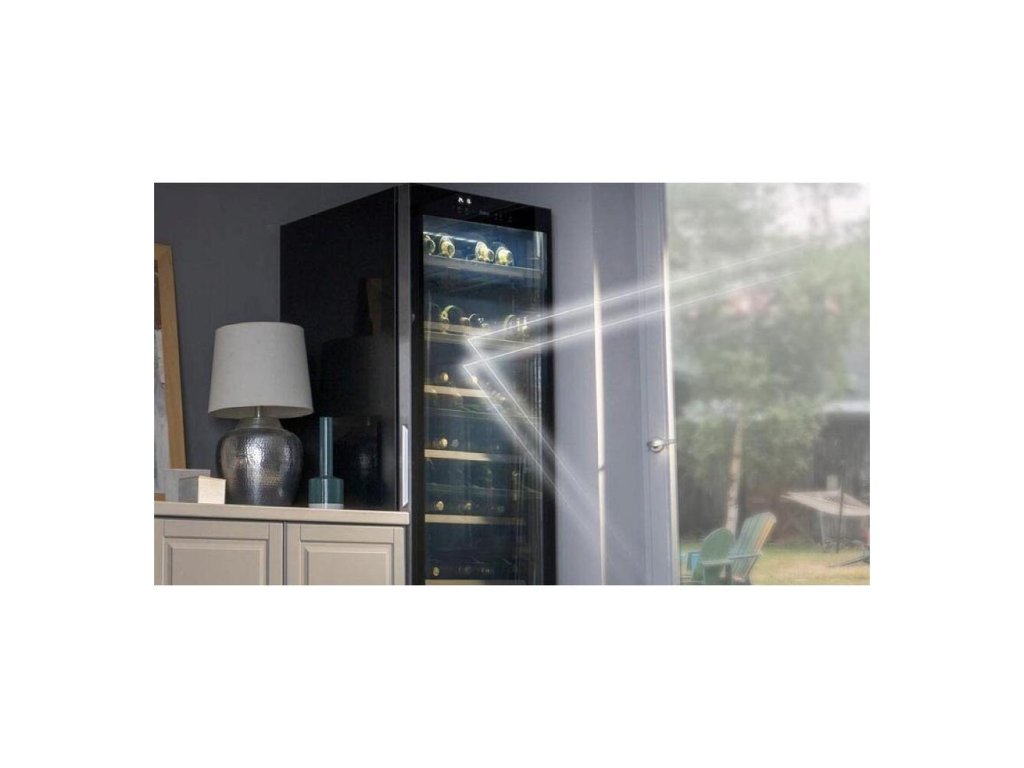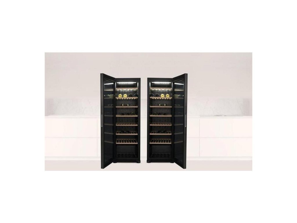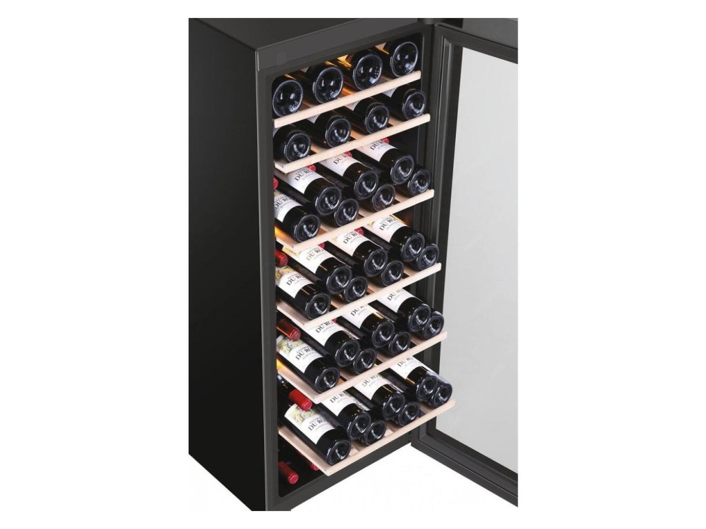- Voľne stojaca jednozónová vinotéka v čiernom prevedení s objemom 84 l a úložným priestorom pre 84 fliaš.