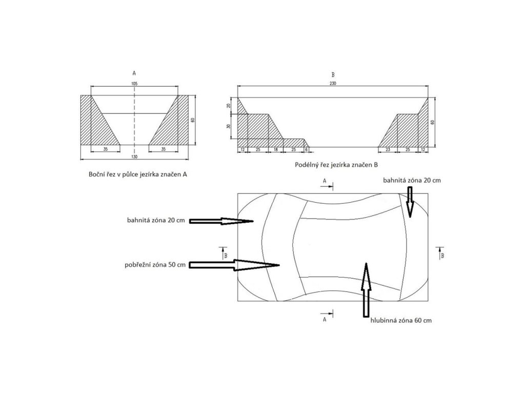 - Najprv vykopte bahnitú zónu (0 - 15 cm) od okrajov do stredu, potom pobrežnú plytkú zónu (15 - 50 cm) a nakoniec hlbokú zónu (od 50 cm). Sklon každej zóny by nemal presiahnuť 30°, inak môže dôjsť k zosunutiu pôdy a sadeníc.