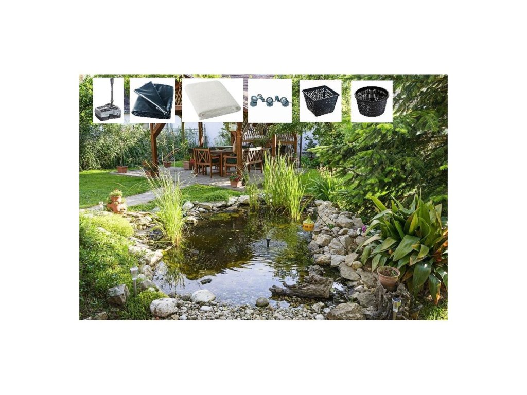Súprava na výstavbu okrasného jazierka obsahuje jazierkovú fóliu, ochrannú jazierkovú geotextíliu pod fóliu, jazierkovú podvodnú filtráciu vrátane filtračných médií, bio domčeky na osídlenie jazierka baktériami, filtračné špongie na hrubé nečistoty, čerpadlo s nízkou spotrebou, UV lampu proti riasam, hadicové prípojky. Osvetlenie jazierka možno použiť vo vode alebo mimo vody vrátane vymeniteľných farebných skiel na zmenu farby osvetlenia. Koše na sadenice pre vodné rastliny. Návod s návrhom na vybudovanie jazierka.