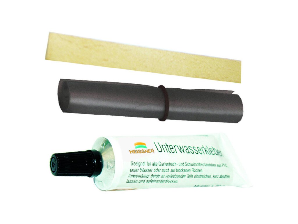Opravná súprava TF855-00 Heissner pozostáva z lepidla na PVC fólie a záplaty (PVC fólie) na opravu poškodeného miesta. Môže sa lepiť za sucha aj pod vodou.