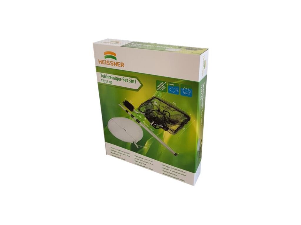 Náradie na čistenie jazierka HEISSNER TZ314-00 je súprava, ktorá obsahuje dve sieťky na zachytávanie nečistôt, kefu na riasy a teleskopickú rukoväť.