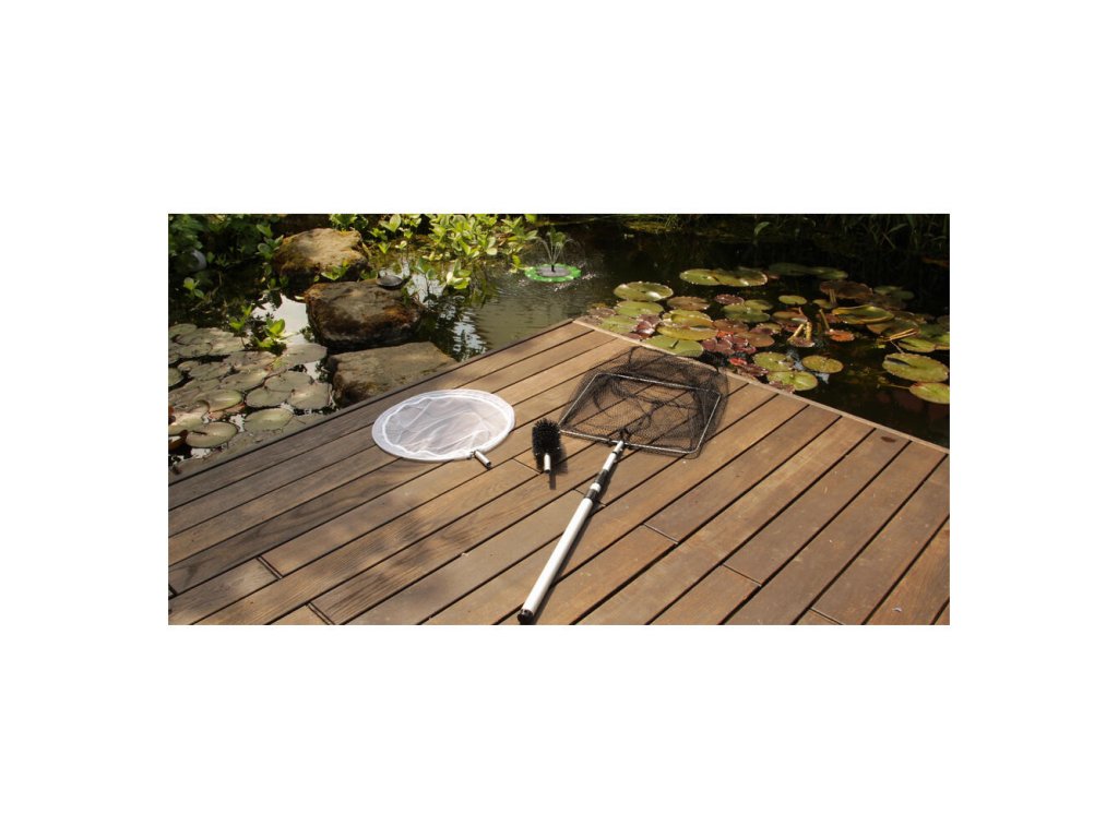 Pomocou jemnej sieťky môžete ľahko zachytiť drobné nečistoty, ako sú brezové semienka, ihličie, malé lístie alebo chumáče rias. Sieťka s väčšími okami 36 x 36 cm je vhodná na listy a odumreté rastliny a menšie vetvičky. Kefka odstraňuje chumáče rias. Všetky takéto nečistoty by sa mali z vodnej hladiny jazierka čo najskôr odstrániť, pretože dlhodobo poškodzujú kvalitu vody a podporujú rast rias.