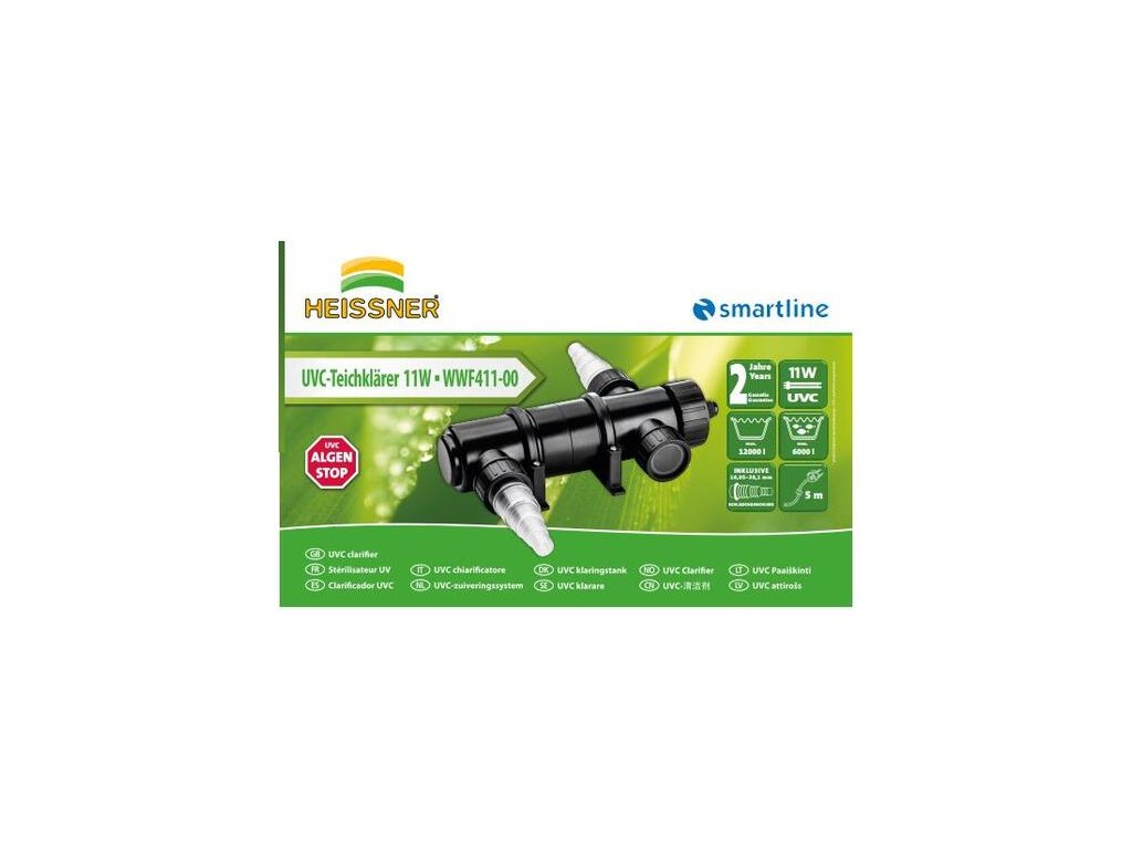 Lampa s výkonom 11 W sa používa na sterilizáciu a redukciu rias v jazierkach s objemom do 12 m³. Je vybavená priezorníkom na kontrolu funkčnosti UV lampy. Jednoduchá demontáž na výmenu UV lampy a čistenie UV kremíkového skla vrátane univerzálnych hadicových prípojok, praktické držiaky na pripevnenie k filtrácii alebo na stenu. Zabudovaný bezpečnostný istič. Žiarivku v UV lampe sa odporúča vymeniť po sezóne, žiarivka svieti, ale už nemá dostatočný vyžarovací výkon. Zároveň odporúčame vyčistiť kremíkové sklo v lampe. Vhodnou náhradnou UV lampou je HEISSNER ZF411-00.