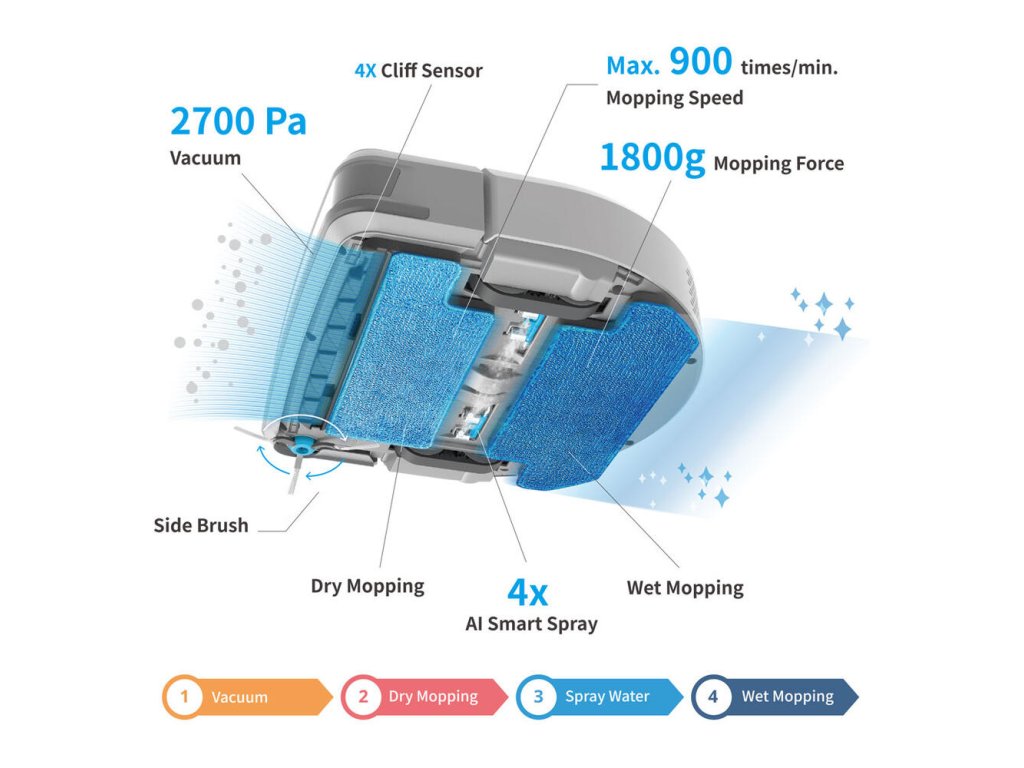 Množstvo vody, ktoré robot dávkuje na čistenú podlahu, riadi systém AI Smart Spray. Vďaka tomu je množstvo dávkovanej vody ideálne pre všetky typy hladkých podláh. Množstvo vody sa reguluje v závislosti od teploty, rýchlosti odparovania vody a čistenej plochy. Po vytretí zostane na čistenej podlahe minimálne množstvo vody.