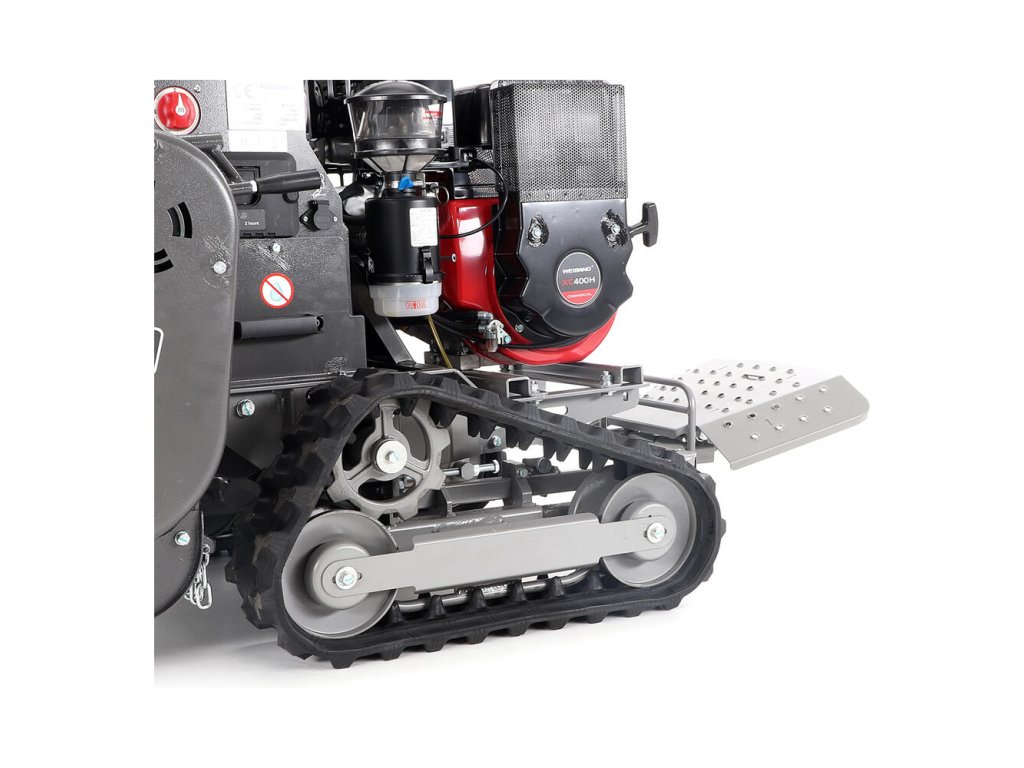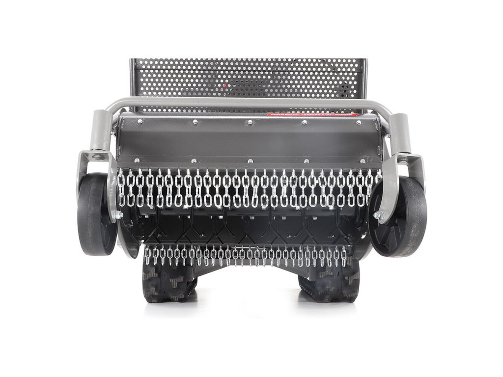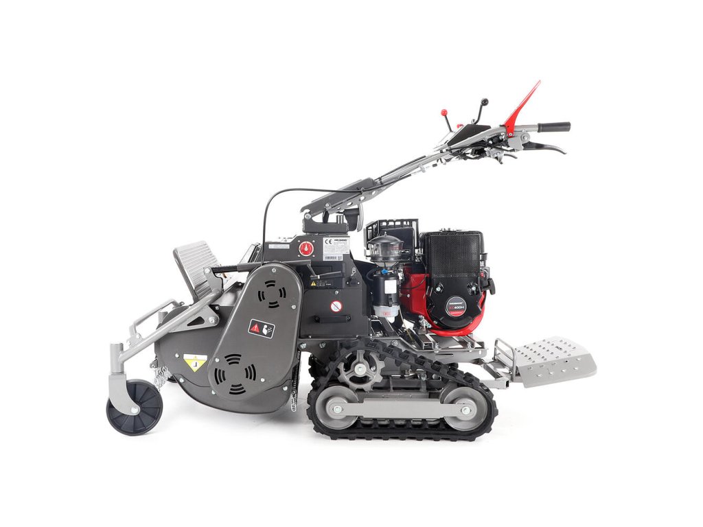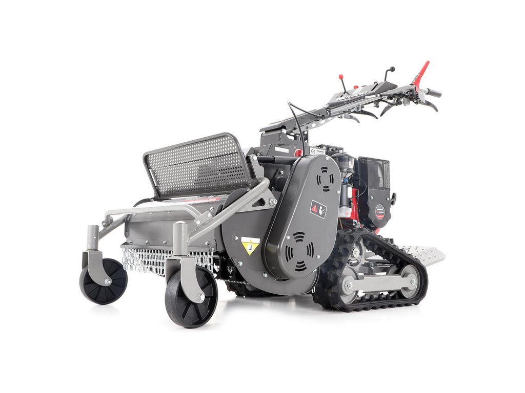 Benefit pre užívateľa: Kosiaci valec je osadený 38 oceľovými nožmi typu Y, ktoré rotujú vysokou rýchlosťou a drvia všetko, čo im príde do cesty – od stariny až po kríky. Pásový podvozok s hrubým dezénom zaručuje stabilitu tam, kde kolesové stroje zapadnú alebo sa prevrátia. Rukoväť je možné bleskovo otočiť do strany, takže môžete viesť stroj bez toho, aby ste kráčali po čerstvo spracovanom mulči. Je to smart solution pre údržbu brehov riek a horských svahov.Hlavné vlastnosti a výhody kosačka Terminator 2