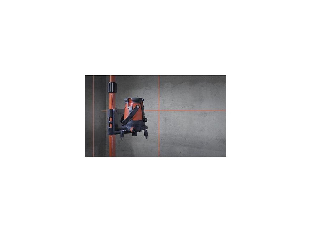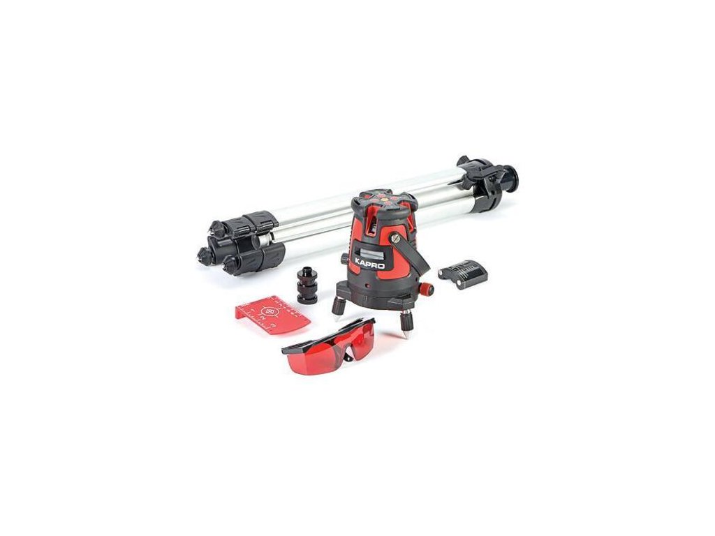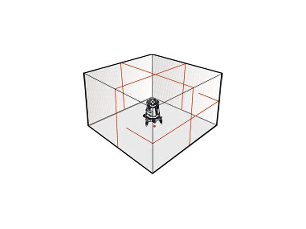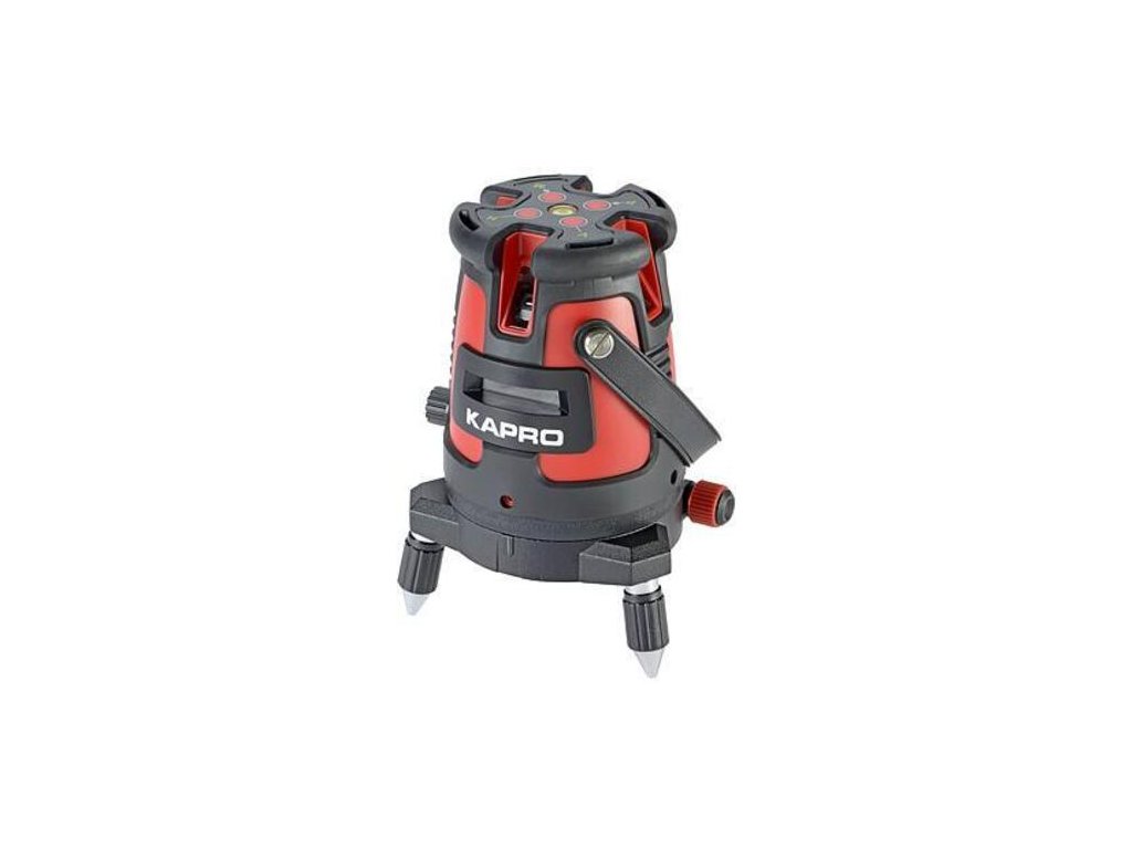 - Laser KAPRO 875S súčasne premieta 1 vodorovný a 4 ortogonálne zvislé lúče, ktoré sa pretínajú vpredu a na strope a taktiež bod laserovej olovnice.
