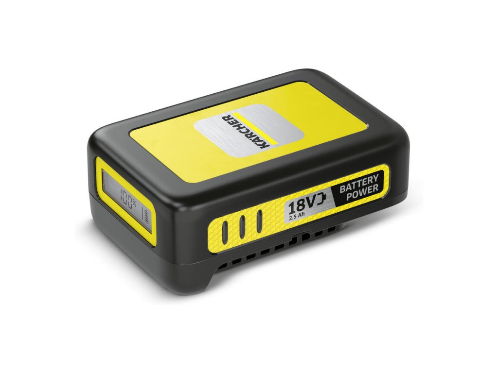 Vďaka inovatívnej technológii Real Time je stav batérie viditeľný na prvý pohľad: integrovaný displej LCD zobrazuje zostávajúcu výdrž batérie, zostávajúci čas nabíjania a stav nabitia – vždy v závislosti od použitého zariadenia. Lítium-iónové články zaručujú konštantný výkon a zabraňujú samovybíjaniu a pamäťovému efektu (strata kapacity v dôsledku častého čiastočného vybíjania). Prvky na telese zabezpečujú protišmykové vlastnosti a stabilitu na hladkých a šikmých povrchoch. Vymeniteľná batéria 18 V/2,5 Ah Battery Power je vhodná na použitie vo všetkých zariadeniach systému batérií 18 V Battery Power.