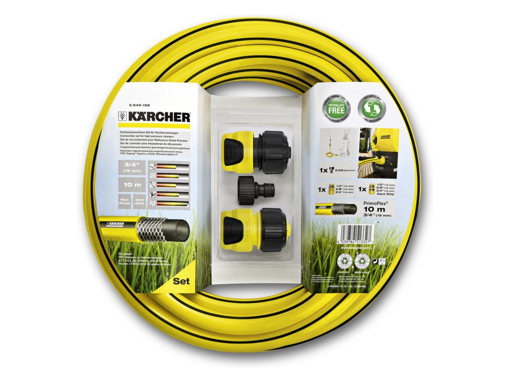Hadicová súprava sa hodí ako prívodná hadica pre vysokotlakový čistič a tiež aj na zavlažovanie záhrady. Súprava sa skladá z 10 m hadice PrimoFlex® (3/4") bez ftalátov, prípojky na vodovodný kohútik G3/4, 1 univerzálnej hadicovej spojky ako aj univerzálnej spojky so systémom Aqua Stop. Záhradné hadice produktového radu Kärcher na zavlažovanie sú extrémne flexibilné, robustné a odolné voči prelomeniu. Dlhá životnosť a jednoduchá manipulácia pre prvotriednu starostlivosť o záhradu.