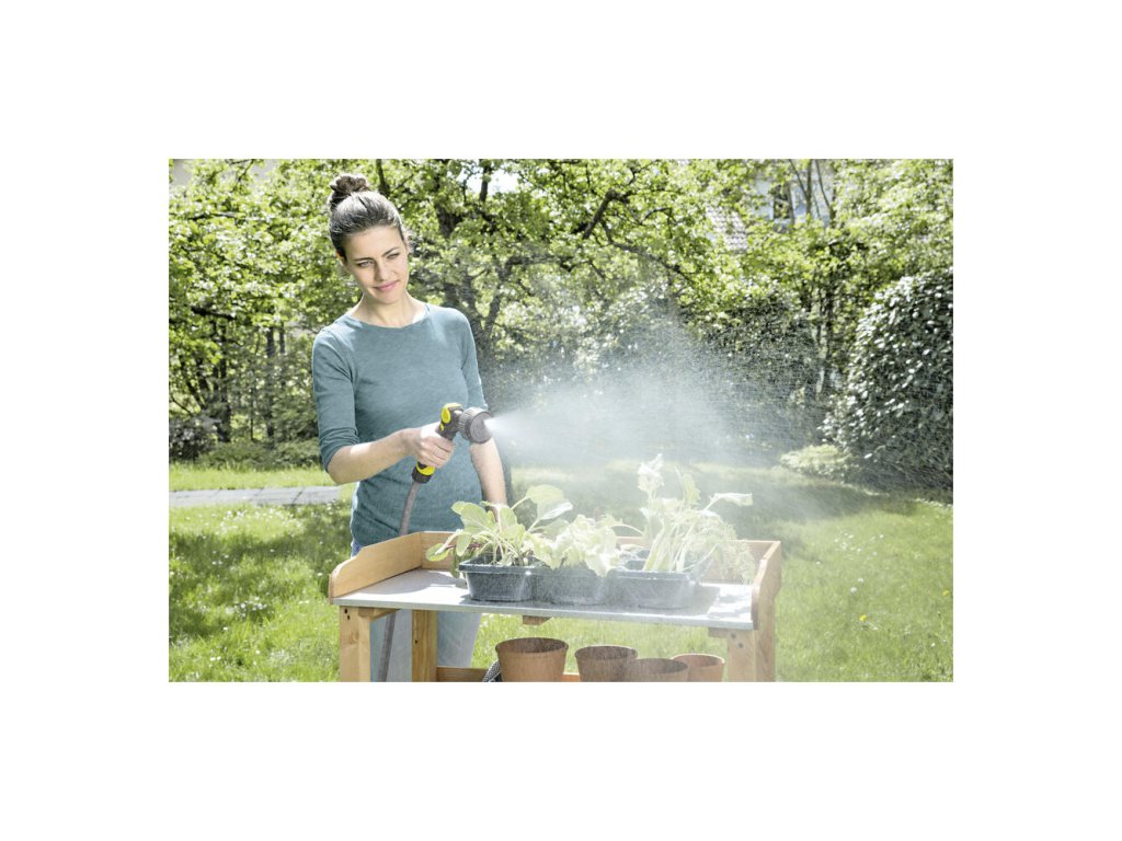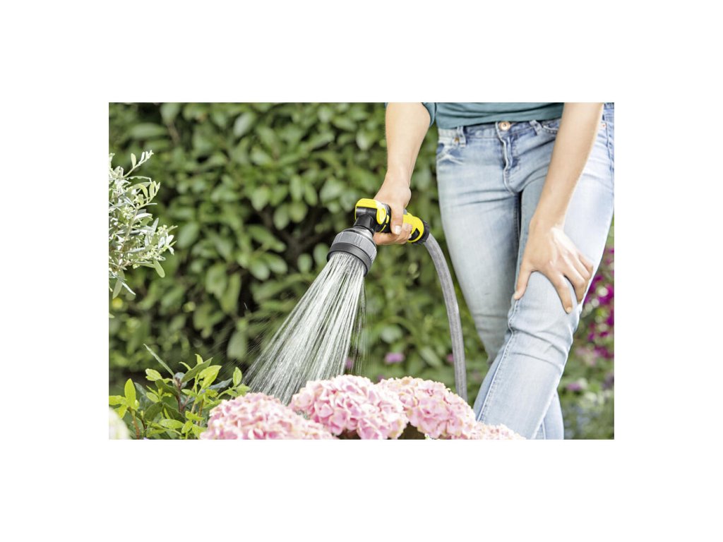Náročné zavlažovanie rastlín s rôznymi nárokmi zvládnete pomocou multifunkčnej striekacej pištole úplne jednoducho. Moderná membránová technológia vyvinutá spoločnosťou Kärcher zaručuje striekaciu hlavu, ktorá nikdy nekvapká – ani počas zmeny tvaru rozstrekovaného prúdu. V prípade potreby sa dá membrána na sprchovom kotúči vybrať a vyčistiť – aby bol vždy dosiahnutý optimálny výsledok striekania. Otočná rukoväť, pomocou ktorej sa dá aretovateľná spúšť nasmerovať dopredu alebo dozadu, umožňuje individuálne a pohodlné používanie. Okrem toho má tento model 4 tvary rozstrekovaného prúdu: sprcha, bodový a plochý prúd ako aj jemná rozprašovaná hmla. Tá sa hodí na jemné zavlažovanie chúlostivých rastlín, zatiaľ čo sprchou sa ideálne polievajú rastlinné a kvetinové záhony. Na menšie úlohy v oblasti zavlažovania sa odporúča bodový prúd. A jednoručne ovládateľný regulačný ventil umožňuje prispôsobovanie prietoku podľa potreby. Mimochodom: Postrekovače Kärcher sú kompatibilné s všetkými dostupnými klik systémami a dajú sa ľahko napojiť na záhradnú hadicu.