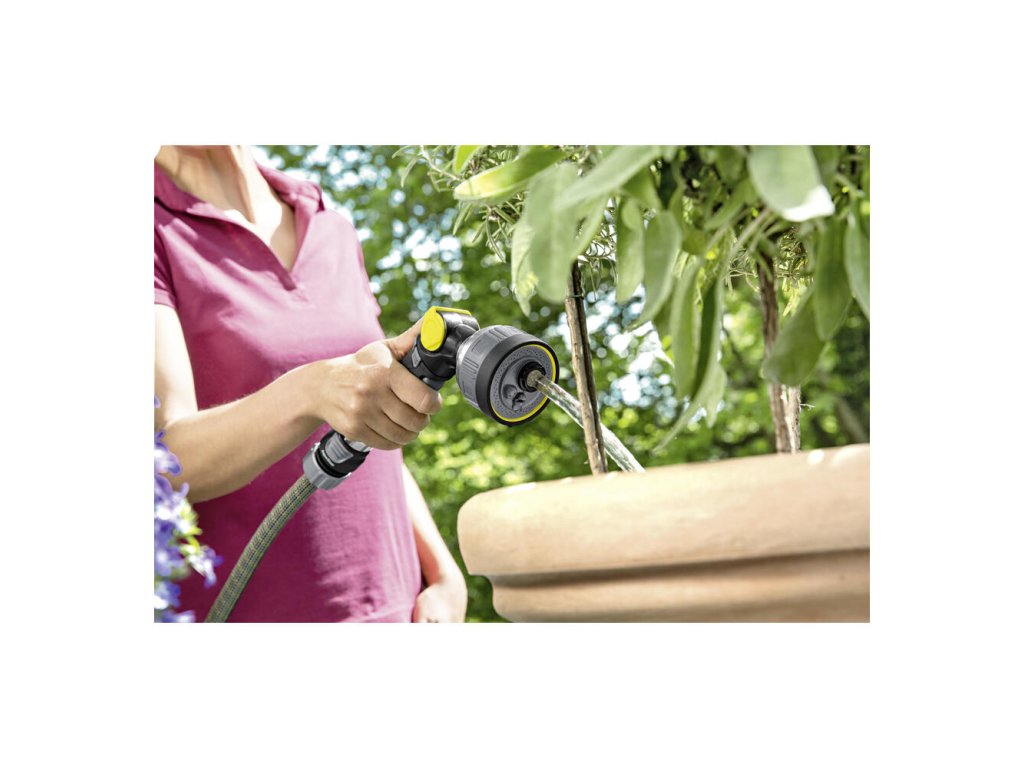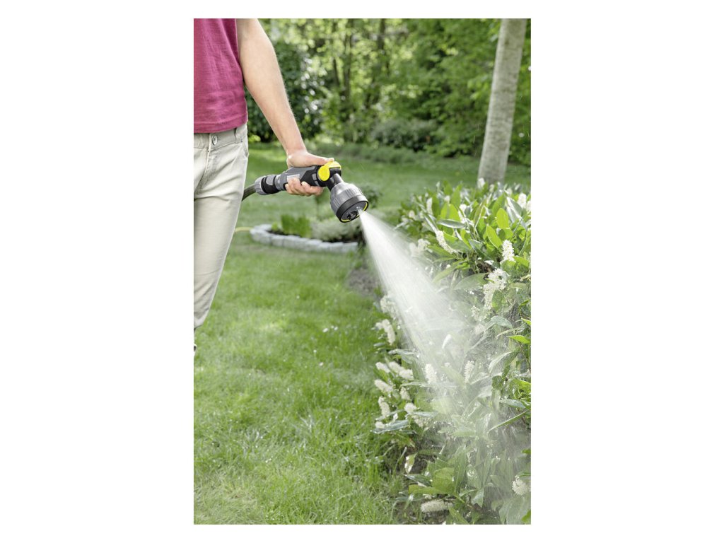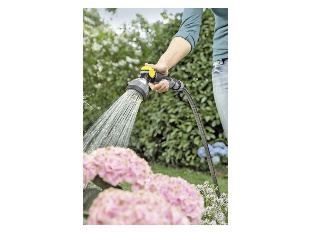 Kovová multifunkčná striekacia pištoľ Premium z kvalitných kovových prvkov je extrémne odolná s obzvlášť dlhou životnosťou. Jej 4 tvary prúdu - sprcha, horizontálny plochý prúd, perlový prúd a jemná hmla - z nej robia multitalent v oblasti zavlažovania rôznych rastlín s individuálnymi potrebami. Jemná rozprašovaná hmla sa perfektne hodí na zavlažovanie chúlostivých rastlín, zatiaľ čo sprchou sa ideálne polievajú rastlinné a kvetinové záhony. Horizontálnym plochým prúdom sa dajú napríklad vyčistiť mierne znečistené plochy. A perlový prúd umožňuje vysoký prietok vody, ktorý sa dá dobre využiť na plnenie nádrží. O používanie bez kvapkania sa stará moderná membránová technológia striekacej hlavy vyvinutá spoločnosťou Kärcher. Taktiež exkluzívne v Kärcheri: Otočná rukoväť, pomocou ktorej sa dá aretovateľná spúšť nasmerovať dopredu alebo dozadu, ktorá dobré sedí v ruke a ktorá umožňuje individuálne a pohodlné používanie. Mimochodom: Postrekovače Kärcher sú kompatibilné s všetkými dostupnými klik systémami a dajú sa ľahko napojiť na záhradnú hadicu.