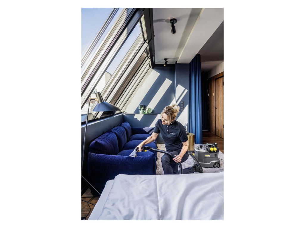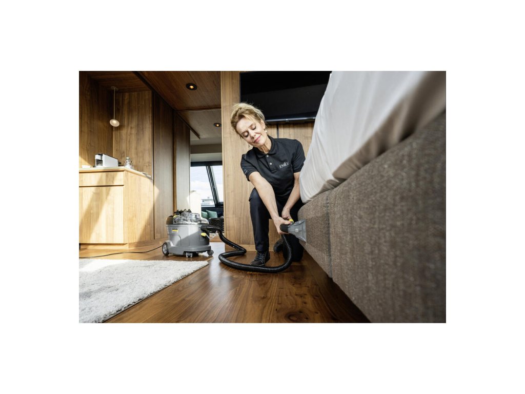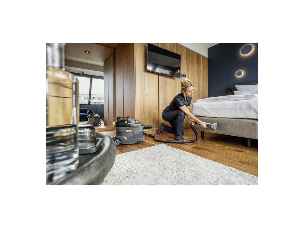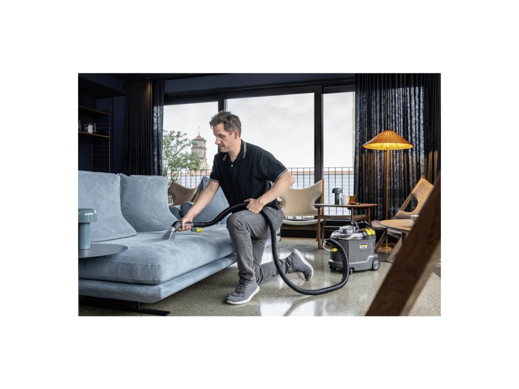 Robustný, odolný, účinný: Tepovač Puzzi 8/1 od spoločnosti Kärcher pôsobivo čistí čalúnenie a odstraňuje škvrny z textilných povrchov s vynikajúcimi a hygienickými výsledkami čistenia a vysokou účinnosťou. Kompaktný stroj na extrakciu rozprašovaním nastrieka čistiaci roztok hlboko do textilných vlákien a potom ho znova odstráni s uvoľnenými nečistotami. Má vynikajúci výkon sania, ktorý zaisťuje rýchle schnutie a znamená, že textilné povrchy je možné opäť rýchlo použiť – ideálne pre vysoké nároky čistiacich pracovníkov v hotelovom a pohostinskom sektore alebo pri čistení interiéru vozidla. Je možné použiť aj štandardnú, extra krátku hubicu na čalúnenie pre pohodlné, ergonomické čistenie úzkych priestorov. Vďaka veľmi nízkej hmotnosti a ergonomickej rukoväti na prenášanie sa dá tento tepovač ľahko prepravovať jednou rukou. Veľké tlačidlá, ktoré je možné ovládať rukou alebo nohou, tiež zvyšujú pohodlie používateľa. Veko spotrebiča a ručná hubica sú priehľadné pre lepší výhľad na špinavú vodu.