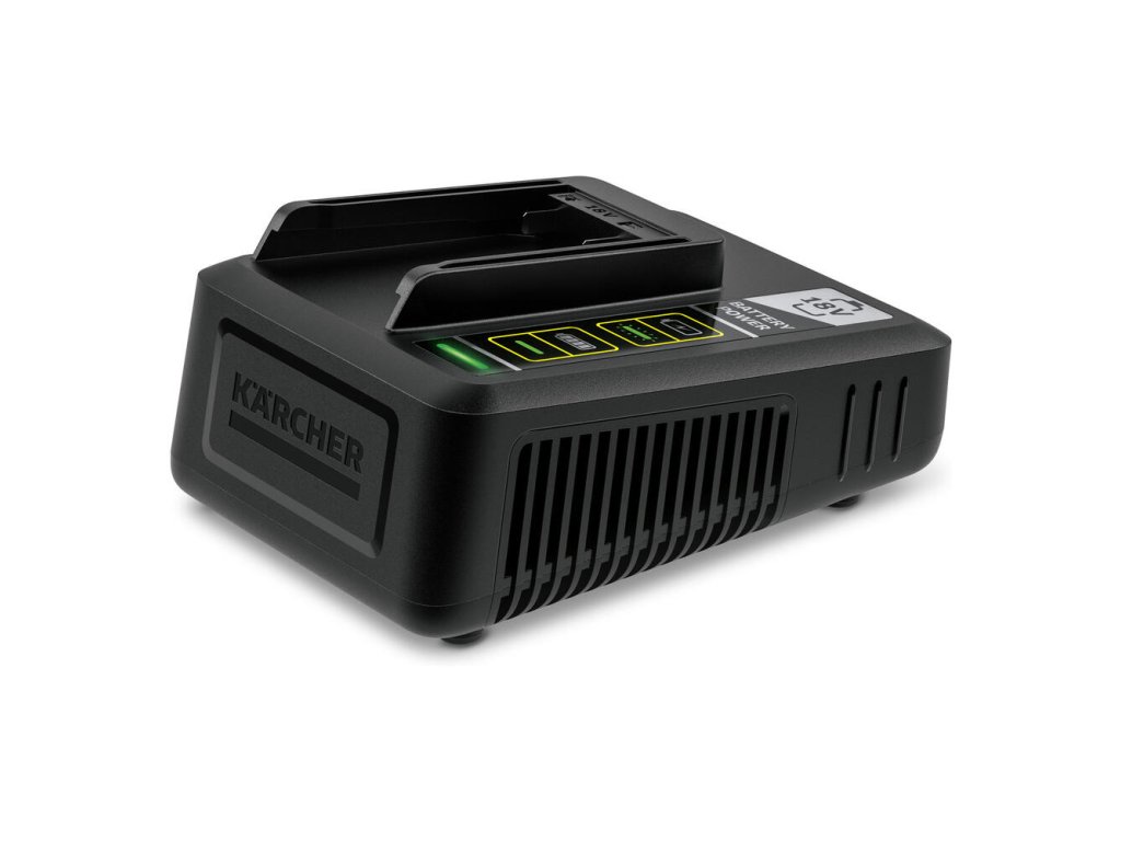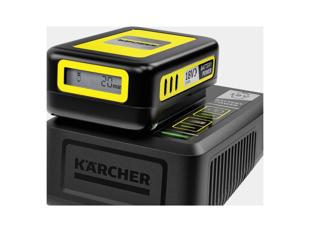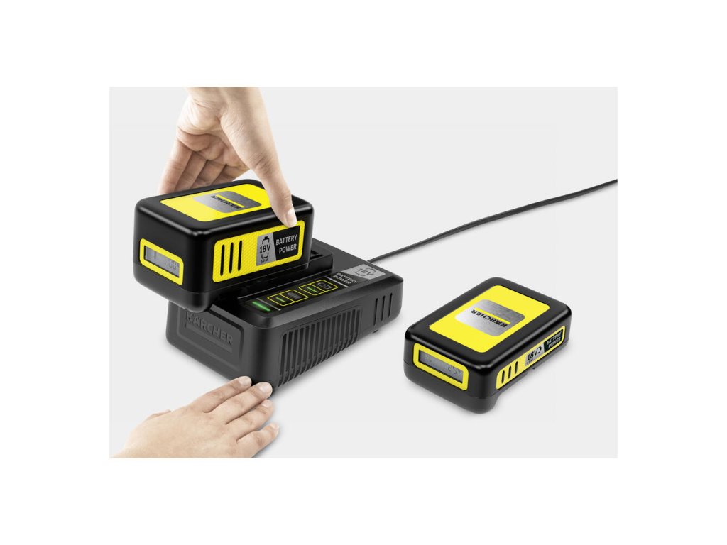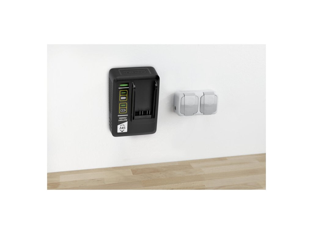 Rýchlonabíjačku je možné upevniť úplne jednoducho na stenu pomocou integrovaného nástenného držiaka. Vďaka rýchlonabíjačke je možné nabiť vymeniteľnú batériu 18 V/2,5 Ah Kärcher Battery Power na 80 % iba za 44 minút. Je možné nabíjať aj všetky ostatné vymeniteľné batérie 18 V Battery Power systému batérií 18 V Kärcher Battery Power.