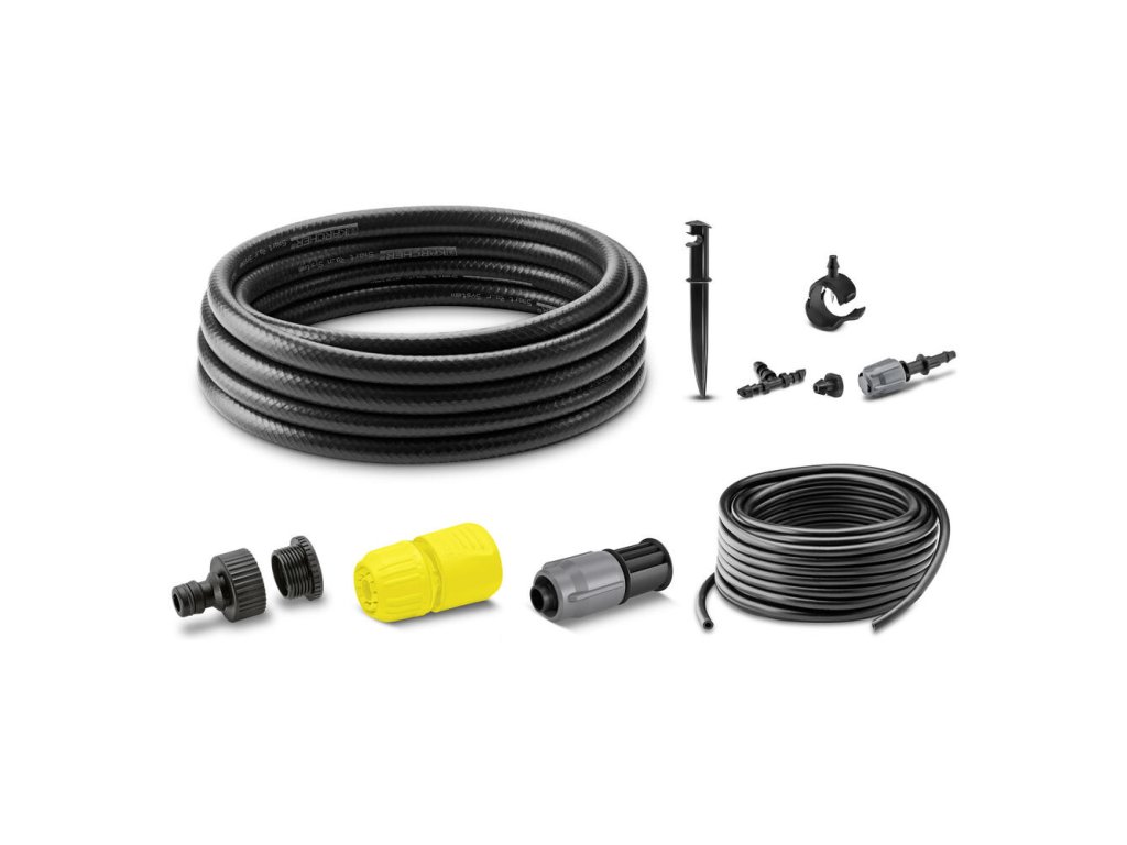 Súprava na zavlažovanie rastlín v kvetináčoch na terasách patrí do radu Kärcher Rain System® a optimálne sa hodí na efektívne zavlažovanie až 15 kvetináčov. Hadicovým systémom s kvapkacími manžetami možno zalievať aj kvetinové hrantíky. Množstvo vody možno individuálne regulovať na každej manžete, čo umožňuje zavlažovanie rastlín podľa potreby bez plytvania vodou. Na prívod vody slúži pružná 1/2'' hadica s dĺžkou 10 m (vrátane prípojky na vodovodný kohútik G3/4 s redukciou G1/2 a spojkou pre pripojenie na vodovodný kohútik). Tenká, 10 metrov dlhá hadica (4mm) sa pripája pomocou manžiet, ktoré sa vďaka integrovanej ihle na hadicu Kärcher Rain System® pripájajú bez náradia. O zavlažovanie v kvetináčoch sa postarajú manžety pre kvapkovú závlahu (15 ks), ktoré možno upevniť pomocou upevňovacích hrotov (15 ks). Súprava navyše obsahuje koncovky (3 malé, 1 veľkú) na uzavretie a T-kusy (10 ks) na spájanie. Systém sa dá ľubovoľne rozšíriť o produkty zo systému Kärcher Rain System® alebo o časovač SensoTimer eco!ogic pre efektívne riadenie zavlažovania.