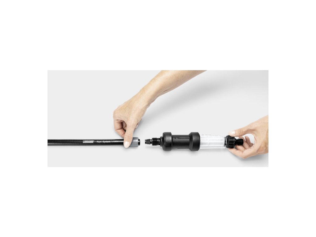 Súprava s kvapkacou hadicou je kompletná súprava pripravená na pripojenie, obsahuje časticový filter, 20 m kvapkaciu hadicu a jednu koncovku. Voda po celej dĺžke hadice kvapká z hadice rovnomerne. Keďže sa voda dodáva presne tam, kde je potrebná, je zavlažovanie živých plotov a kríkov optimálne. Hadica sa dá podľa potreby skrátiť a bezpečne uzavrieť pomocou koncovky. Dvojvrstvová hadica neobsahuje kadmium, bárium a olovo, a tým je zdravotne úplne neškodná. Ideálne sa hadica prevádzkuje s tlakom do 2 barov. Časticový filter chráni kvapkaciu hadicu pred čiastočkami špiny. Filtračná vložka sa dá bez problémov vybrať a vyčistiť. Na vstupnej strane sa nachádza prípojka na vodovodný kohútik, ktorá je kompatibilná so všetkými známymi klik systémami. Efektívny zavlažovací systém Kärcher Rain System® v sebe spája výhody mikro-kvapkania a bežného zavlažovania. Pracuje s tlakom do 4 barov a dá sa individuálne prispôsobiť takmer každej záhrade.