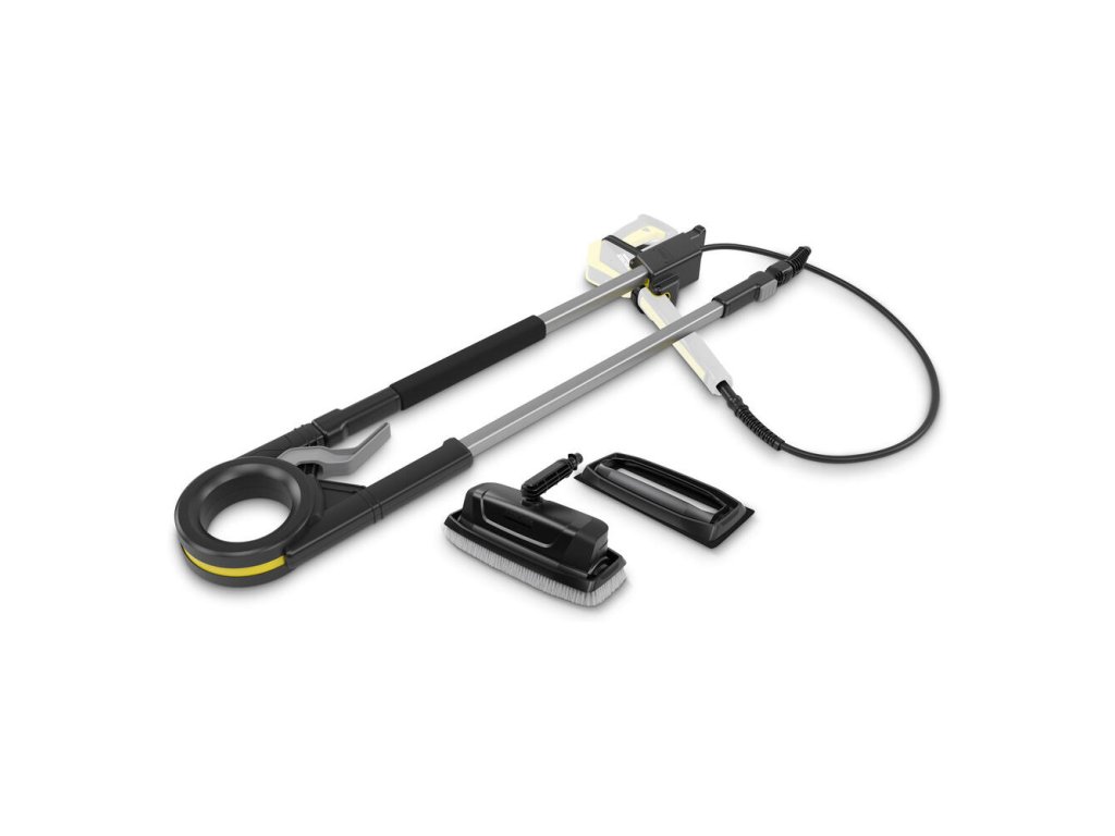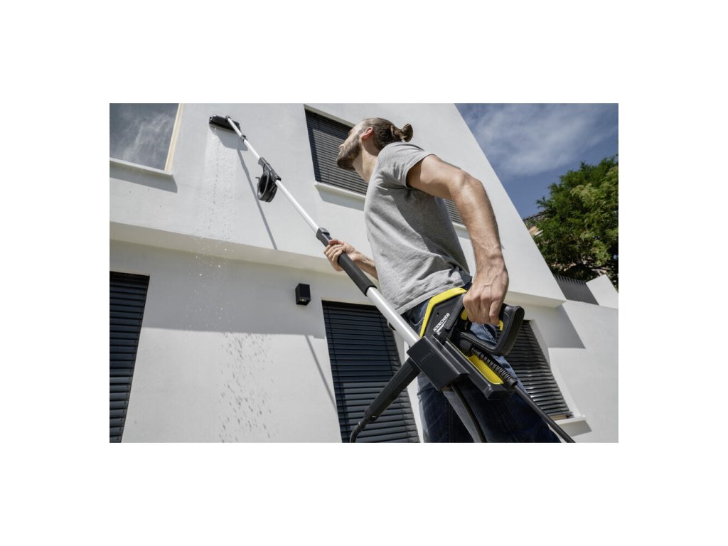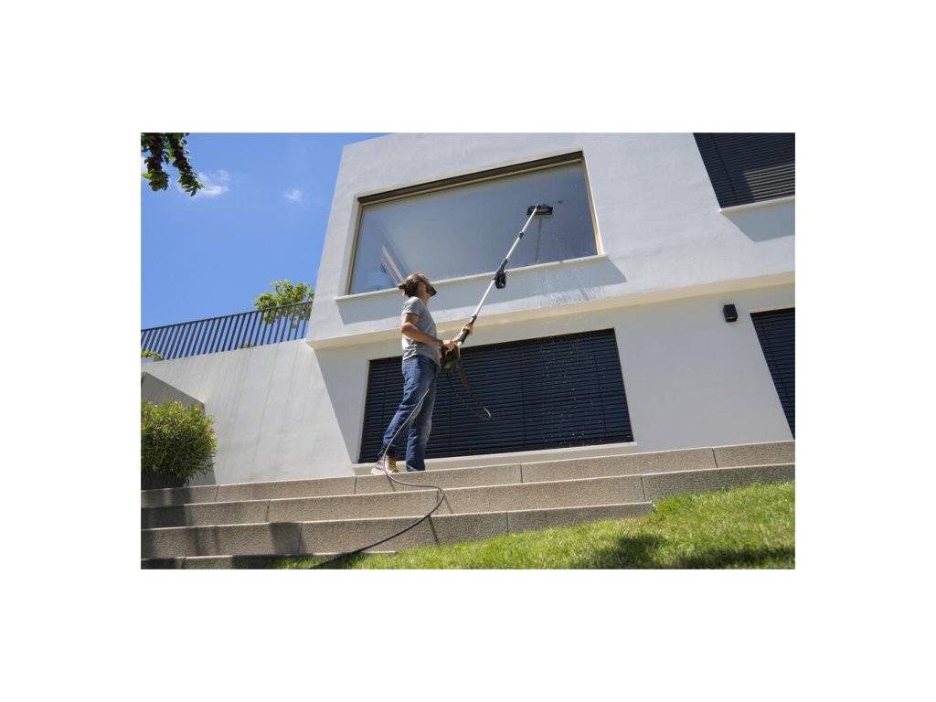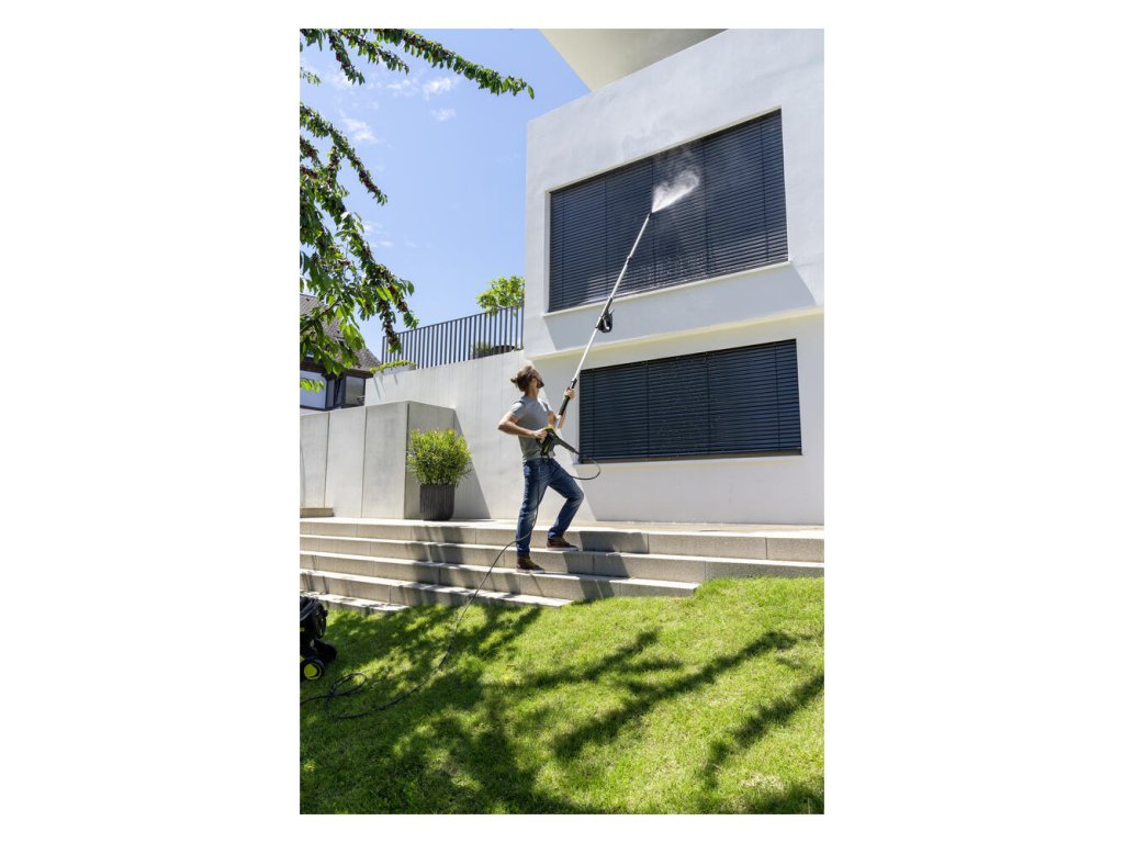 Pomocou teleskopického nadstavca je možné rýchlo a bez námahy vyčistiť aj ťažko prístupné miesta, napríklad pod fasádami. Nastaviteľný pánt o 180 stupňov je ďalšou výhodou a umožňuje čistenie zimných záhrad, šikmých striech a prístreškov na auto. Vďaka prevádzke s fasádnym a nadstavcom na čistenie skla sa rovnomerne a efektívne vyčistia všetky ťažko prístupné oblasti: Štyri vysokotlakové dýzy eliminujú odolné nečistoty na rôznych povrchoch.