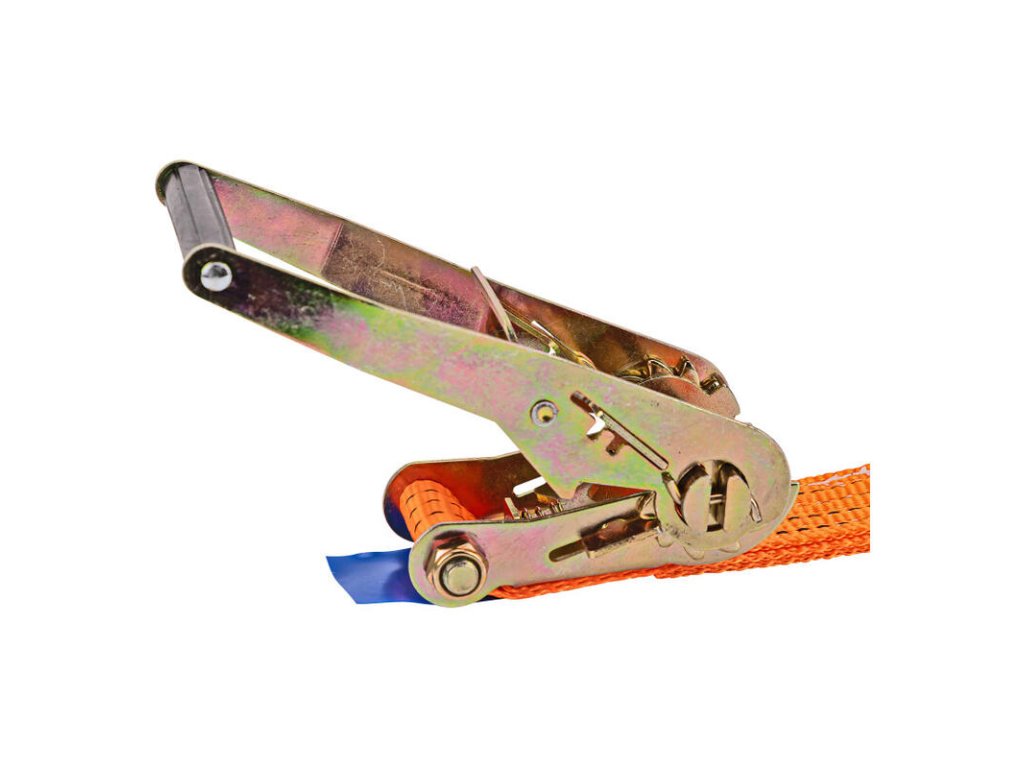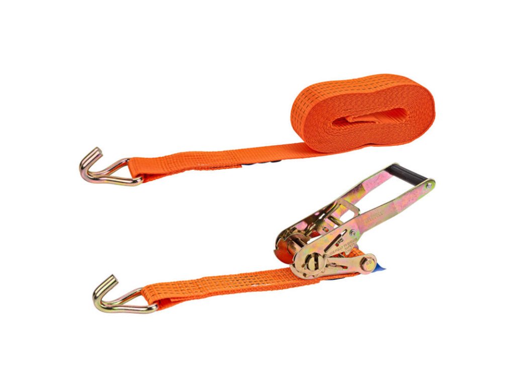 Dvojdielny upínací popruh s račňou udrží náklad pevne a bezpečne, a to na prívese, plošine automobilu, v dodávke alebo v batožinovom priestore automobilu. Nekomplikovaná manipulácia a spoľahlivosť sú na prvom mieste. Bezpečný a rýchly proces upnutia. Upínací popruh vyrobený z odolnej polyesterovej tkaniny (PES). Odolný proti UV žiareniu, nízka citlivosť na chlad. Popruh nikdy nepoužívajte na zdvíhanie bremien.