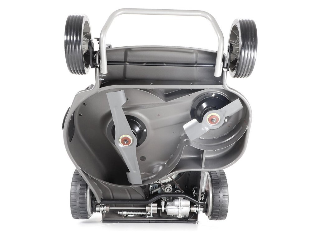 Prečo má kosačka dva nože namiesto jedného veľkého?Dva menšie nože majú nižšiu obvodovú rýchlosť pri vyššom krútiacom momente, čo zaisťuje lepší zber do koša a kvalitnejšie mulčovanie bez preťažovania hriadeľa.