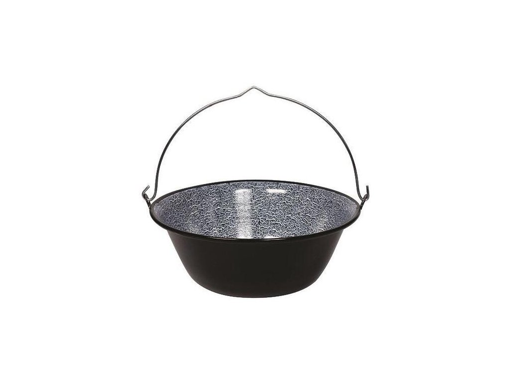 Kovový kotlík 20 lit, smaltovaný na guľáš s pozinkovaným kovovým držadlom. Vhodný na prípravu jedla pri táborení v prírode, pri vode alebo v domácnosti.