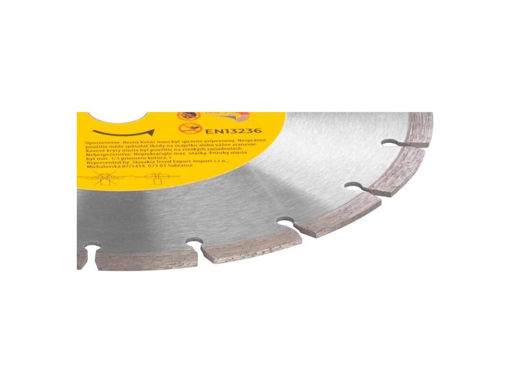 Diamantový kotúč Strend Pro je vhodný pre domácich kutilov, ale aj pre profesionálnych remeselníkov. Vhodný je na suché rezanie. technológia SEGMENT poskytuje najvyššiu rýchlosť a výborné chladenie kotúča. Má široké použitie - betón, žula, kameň, murivo, tehly, železobetón a možno ho použiť na obklad, dlažbu a strešnú krytinu. Jeho priemer je 230 mm a maximálne povolené otáčky sú 6 600 rpm.