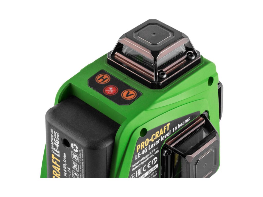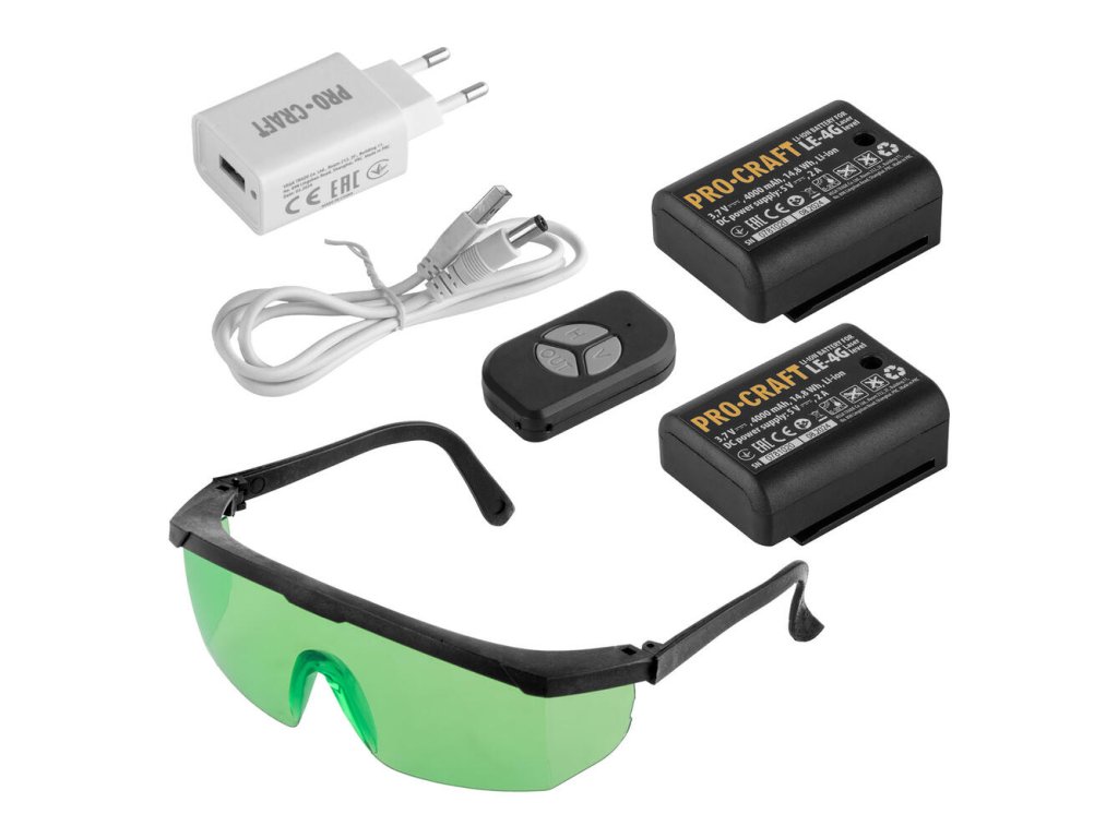 Laser ProCraft LE-4G je možné napájať z akumulátorov (2× 3,7 V / 4000 mAh) alebo priamo zo siete, čím poskytuje maximálnu flexibilitu a neobmedzenú prevádzku. Vďaka diaľkovému ovládaniu a magnetickému nástennému držiaku sa jednoduchá obsluha stáva samozrejmosťou.