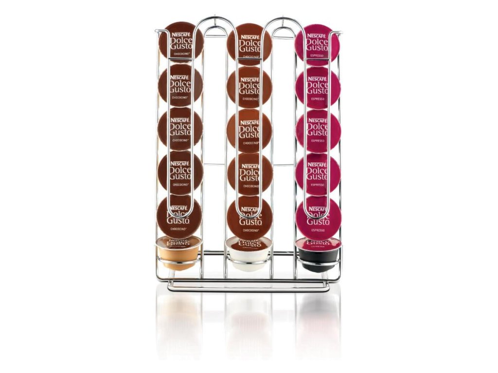 Nerezový držiak na kapsule Nescafé Dolce Gusto, môžete jednoducho umiestniť v priestore, alebo zavesiť na stenu. Držiak disponuje kapacitou na 18 kapsúl. Kapsule sú usporiadané v 3 stĺpcoch.