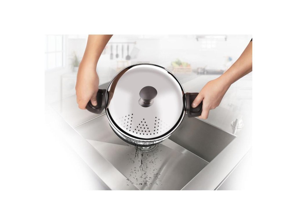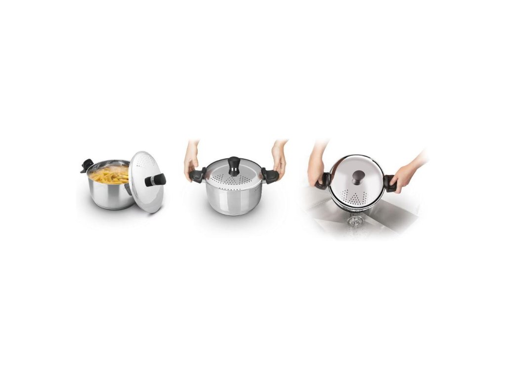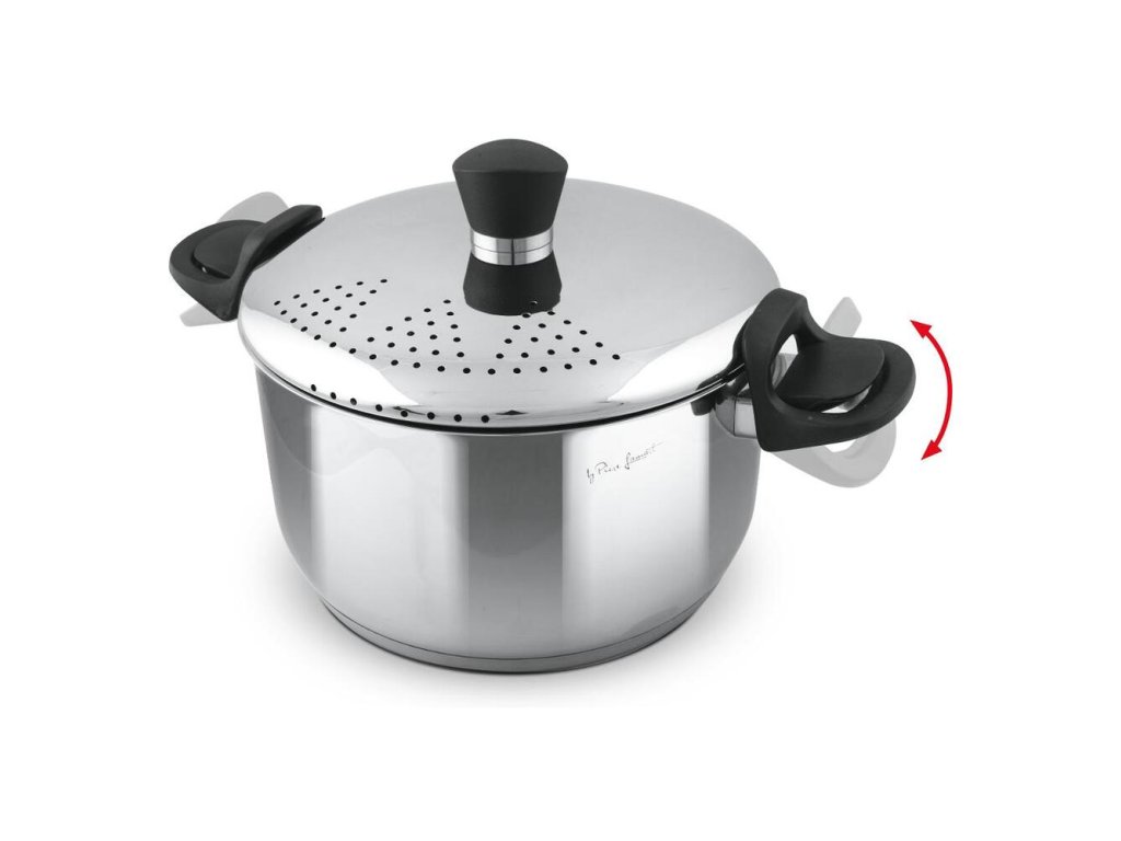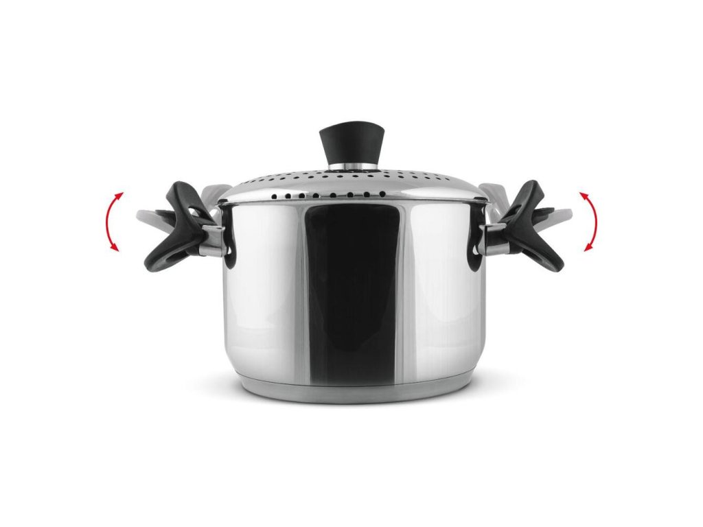 Pokrievka s cediacim mechanizmom z nehrdzavejúcej ocele so špeciálnym zachytením pomocou výklopných rukovätí pre komfortné cedenie cestovín