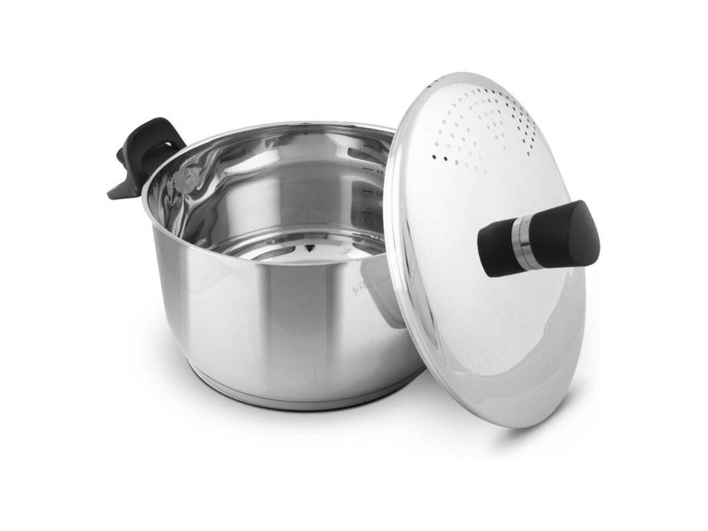 Hrniec s cedidlomHrniec vyrobený z prvotriednej nehrdzavejúcej ocele vrátane pokrievky, vybavený silným sendvičovým dnom