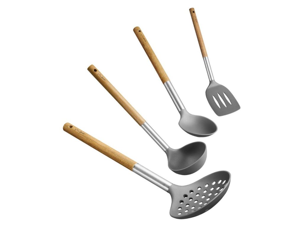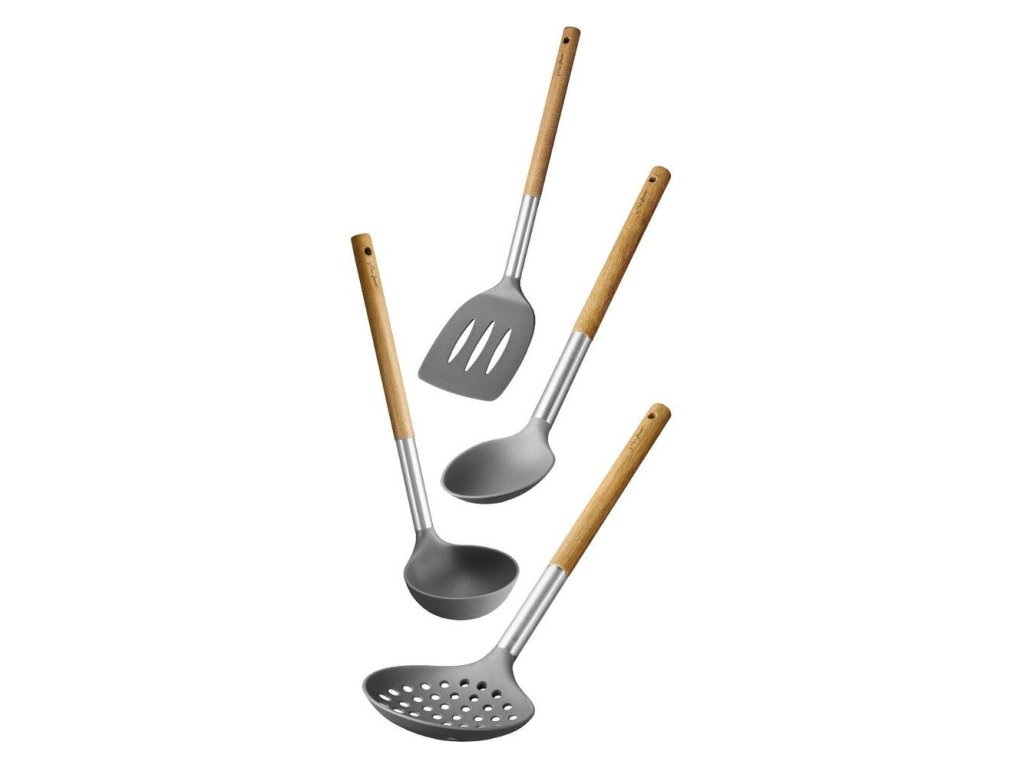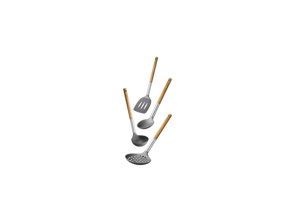 Sada nylonového náčinia s drevenou rukoväťou (akácia), odoláva teplote do 210 ° C, vhodné do umývačky riadu, 3 roky záruka, naberačka 29 cm, penovačka 35 cm, obracačka 35 cm, lyžica 34 cm