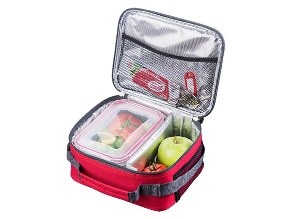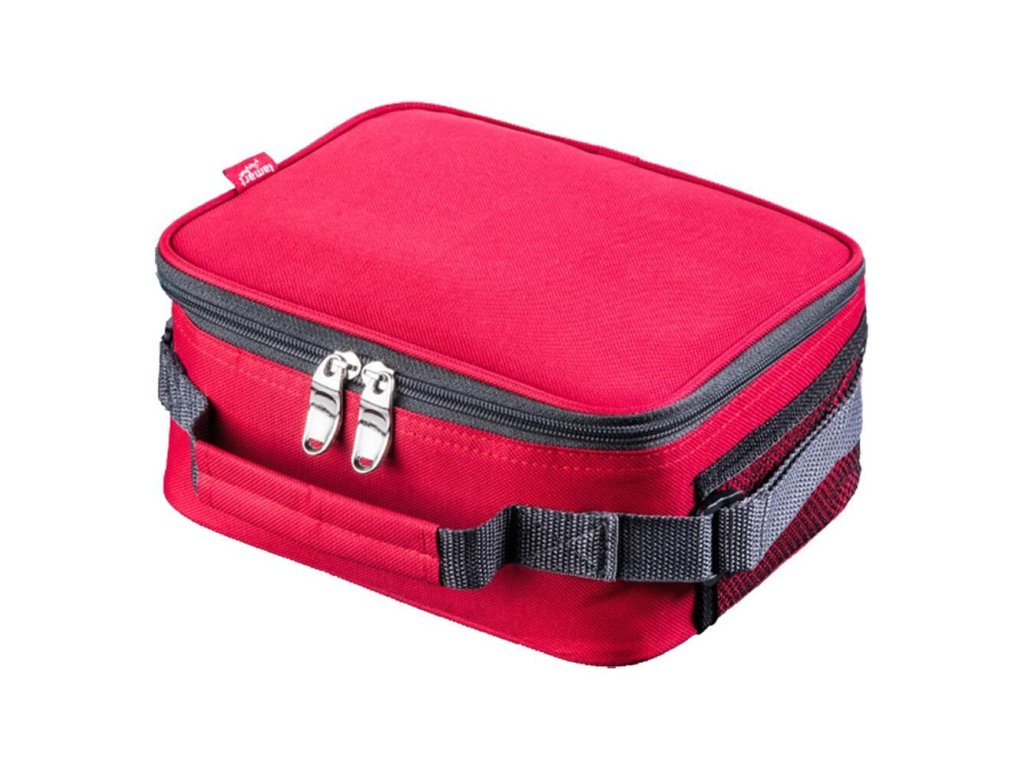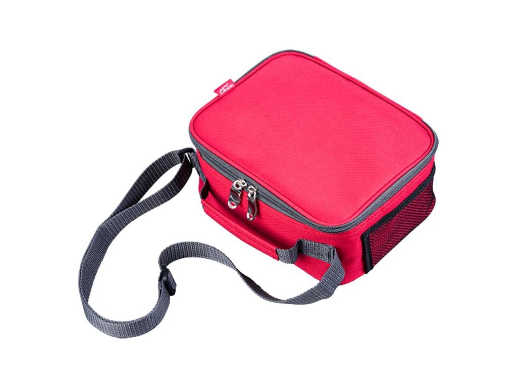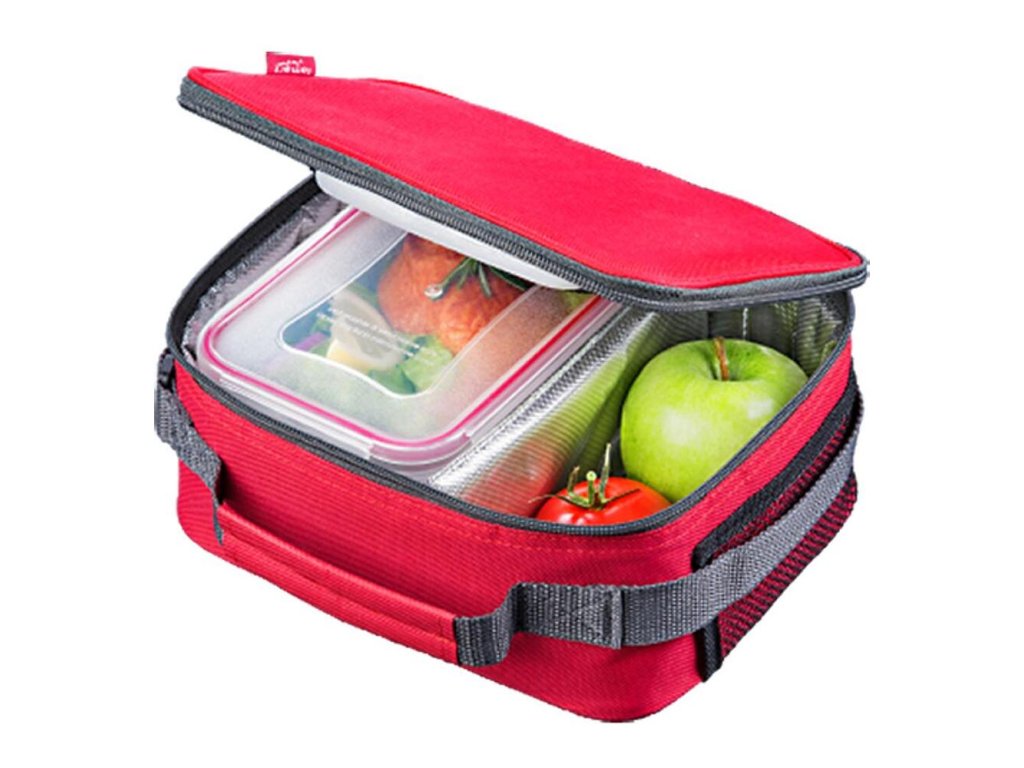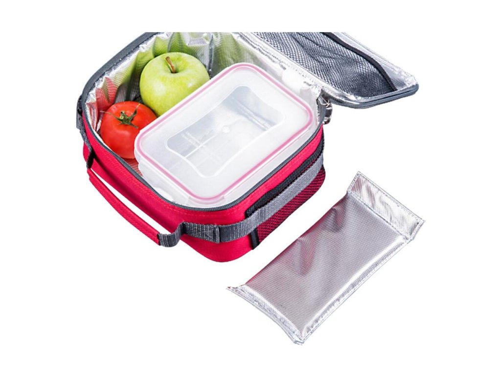 Termotaška s chladiacou vložkou a plastovou dózouTermotaška je vyrobená z polyesterovej textílie, pevná a ľahká PEVA izolácia s oddeliteľnou prepážkou, popruhom na rameno a uškami