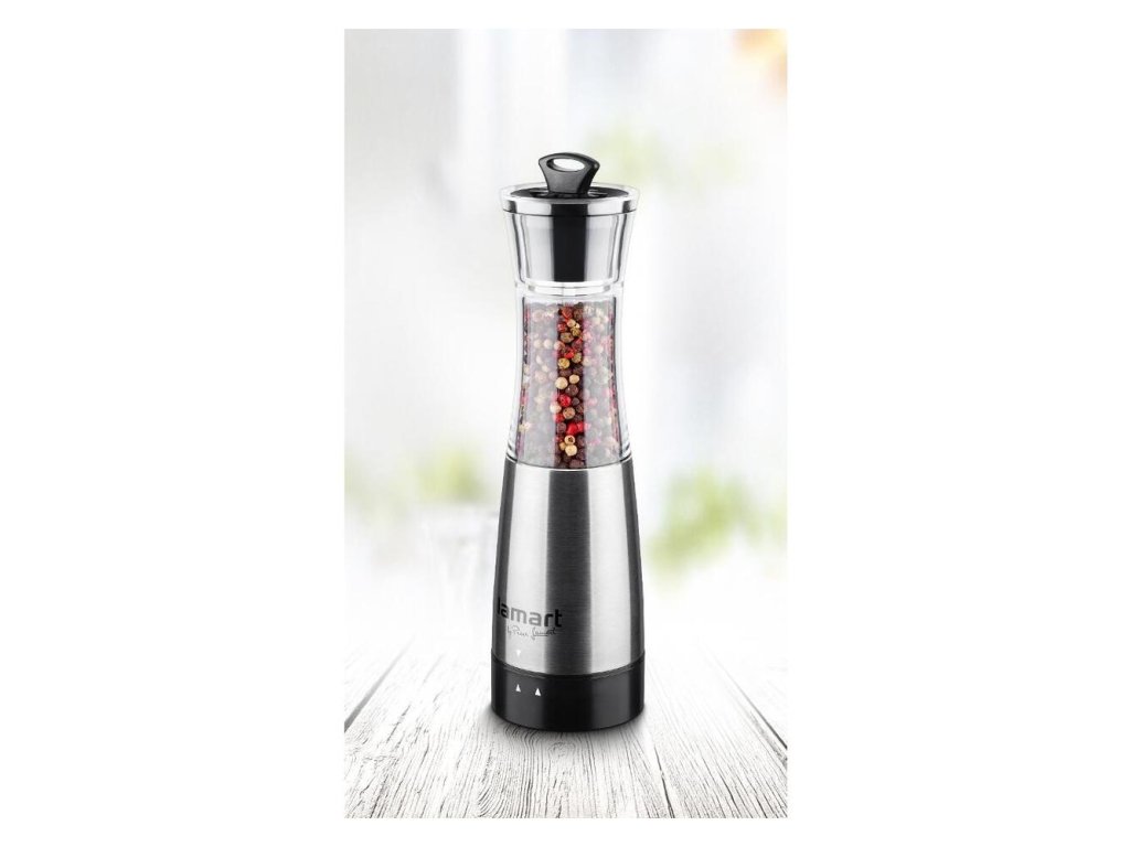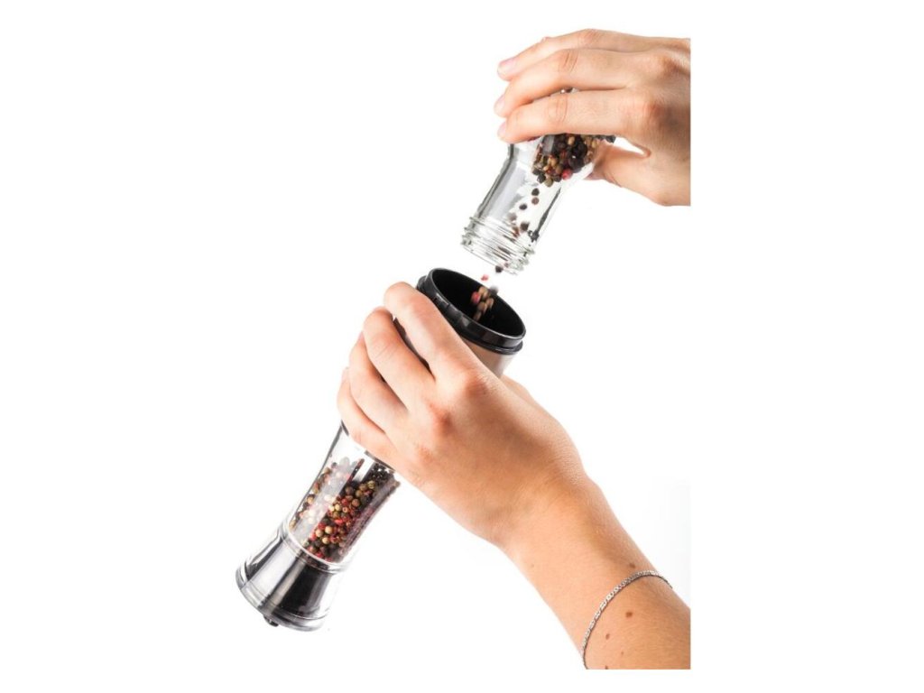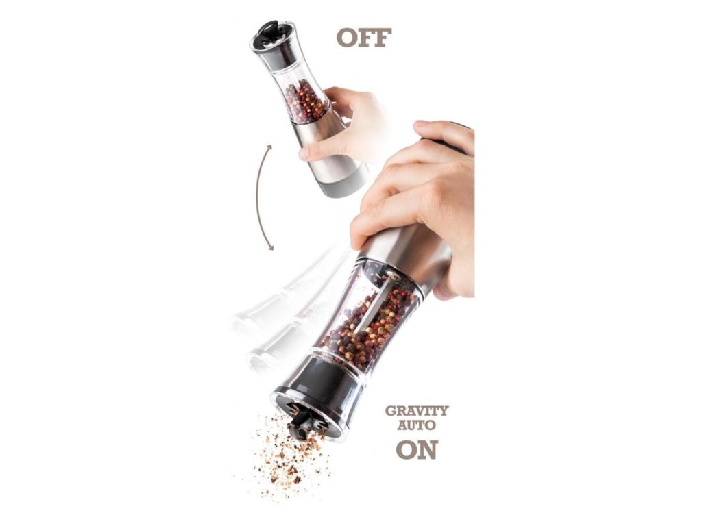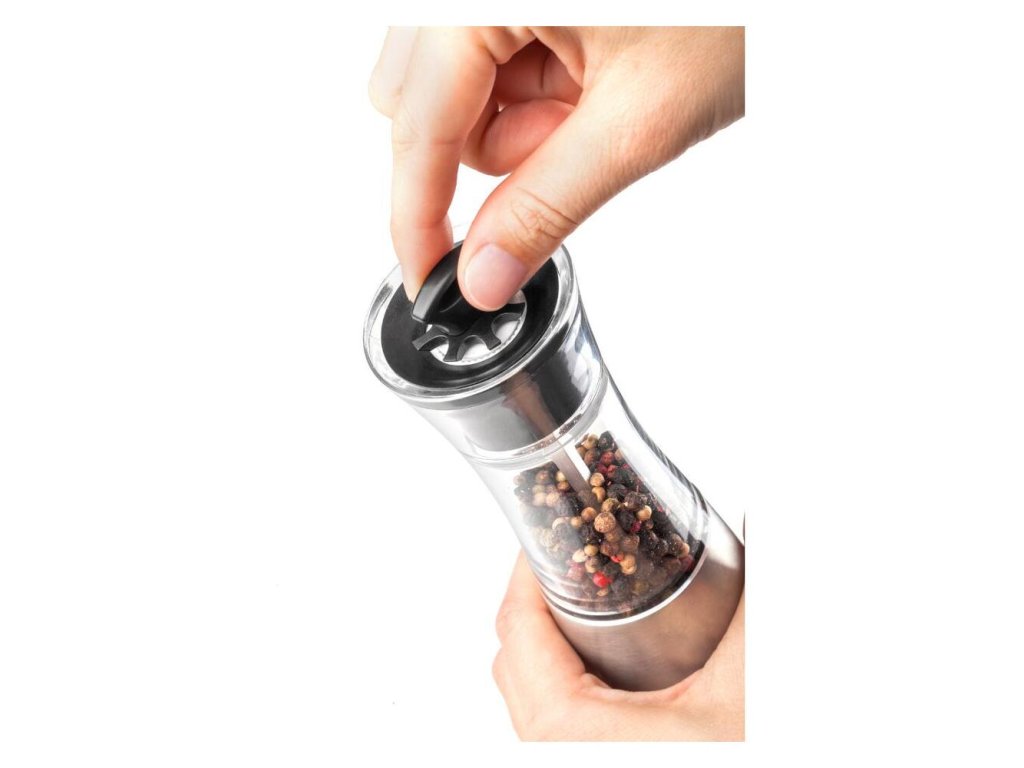 Mlynček na korenie/soľMlynček na korenie/soľ je vyrobený z nehrdzavejúcej ocele a plastu s keramickým mlecím mechanizmom s nastaviteľnou hrúbkou mletia