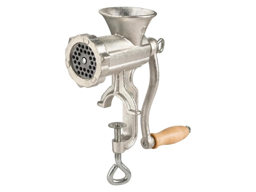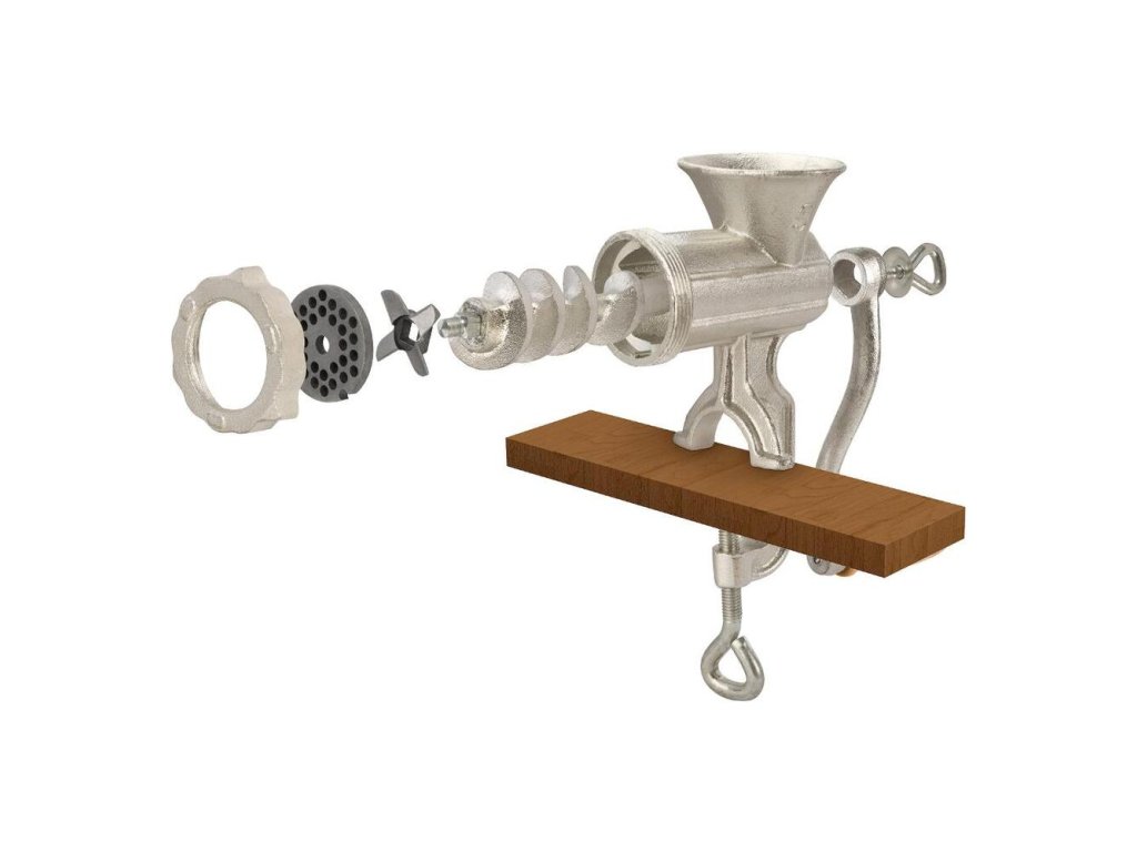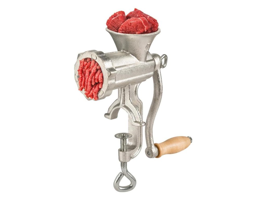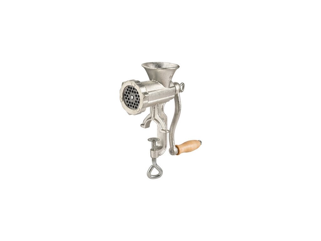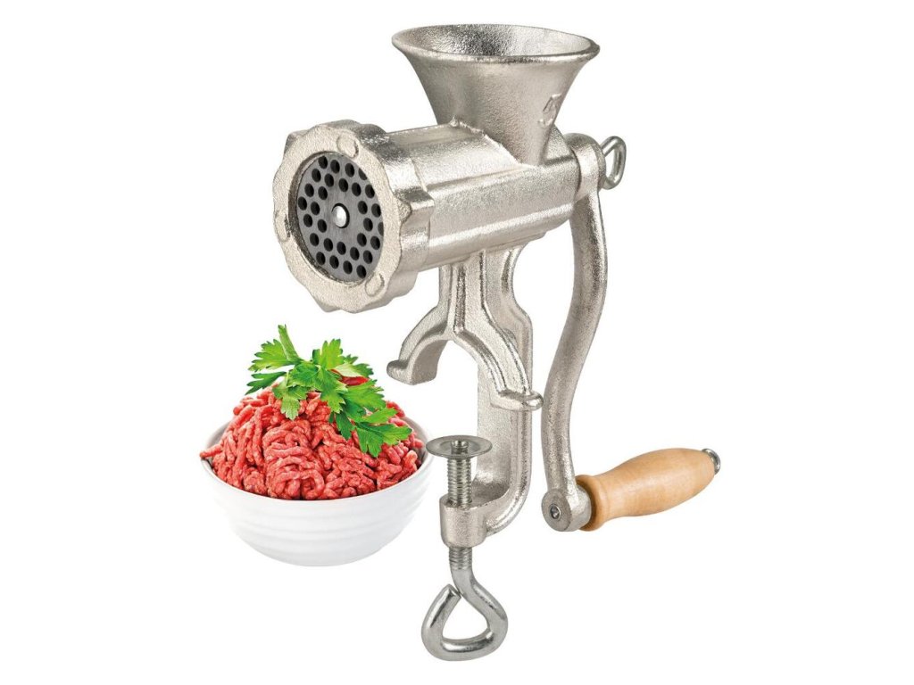 Mlynček na mäso s upínacím mechanizmom a dreveným madlom kľučky