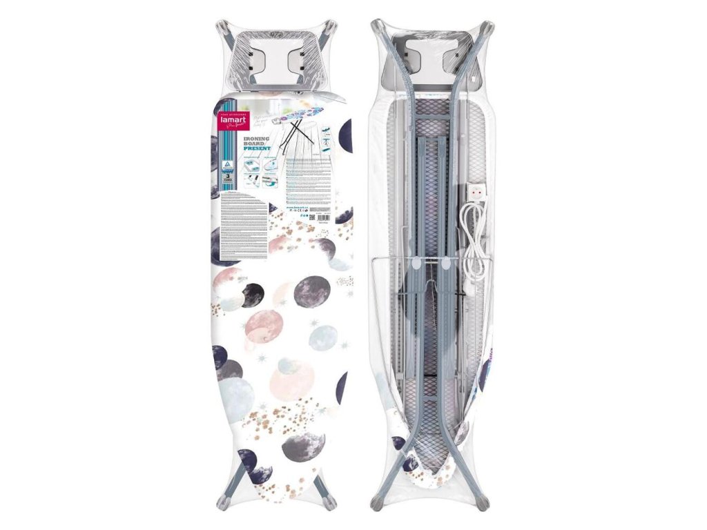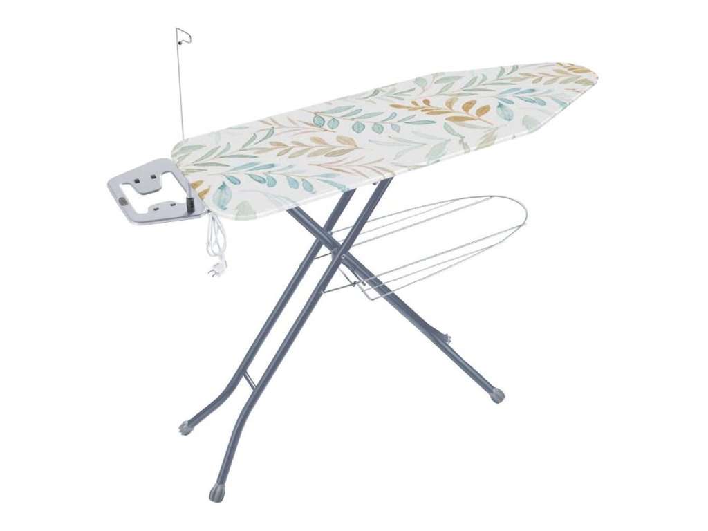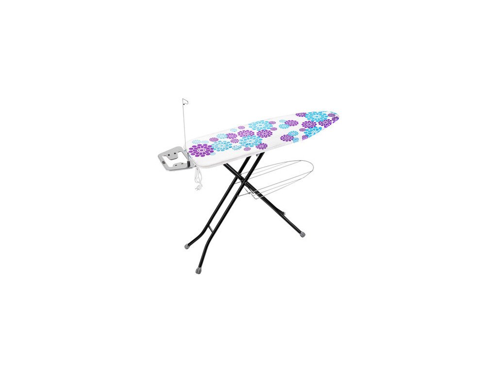Kvalitná žehliaca doska s transportným zámkom, žehliacou plochou odvádzajúcou paru, elektrickou zásuvkou a držiakom elektrického kábla. Žehliaca doska sa dodáva v čiernej kovovej konštrukcii a s farebným bavlneným poťahom. Doska má stabilnú a bezpečnú konštrukciu s protišmykovými koncovkami. Doska na žehlenie s elektrickou zásuvkou s rozmermi 120 x 38 cm. Doska je výškovo nastaviteľná do 92 cm s odkladacou plochou pre naparovacie žehličky so silikónovými prvkami proti poškodeniu plochy a žehličky pri odložení a odkladaciu plochou pre prádlo.