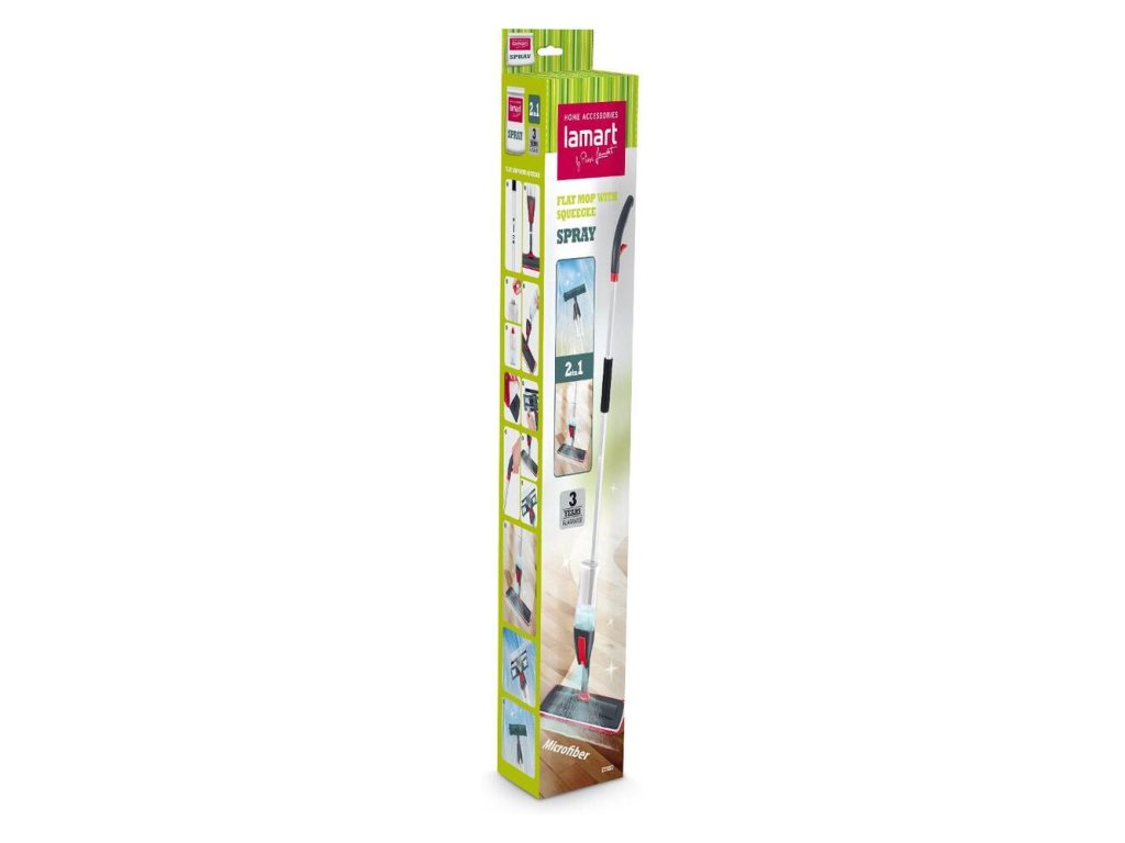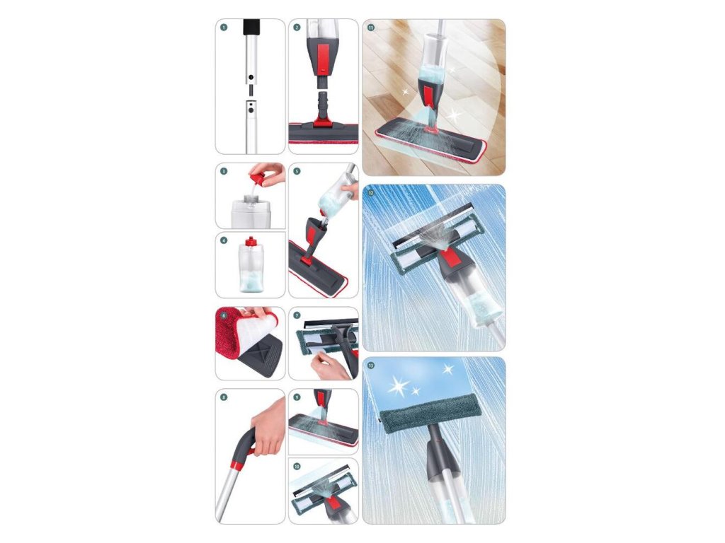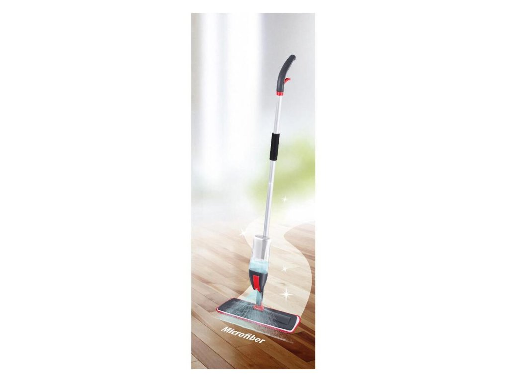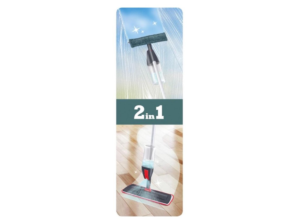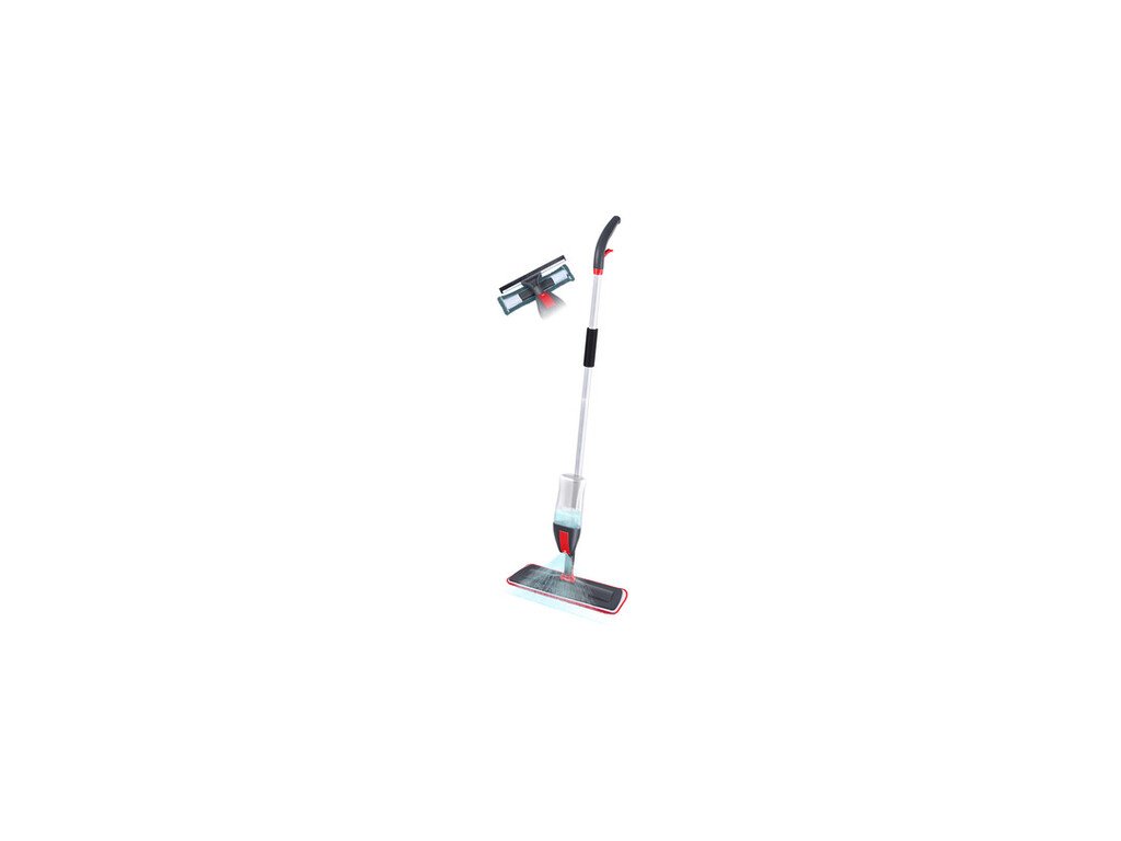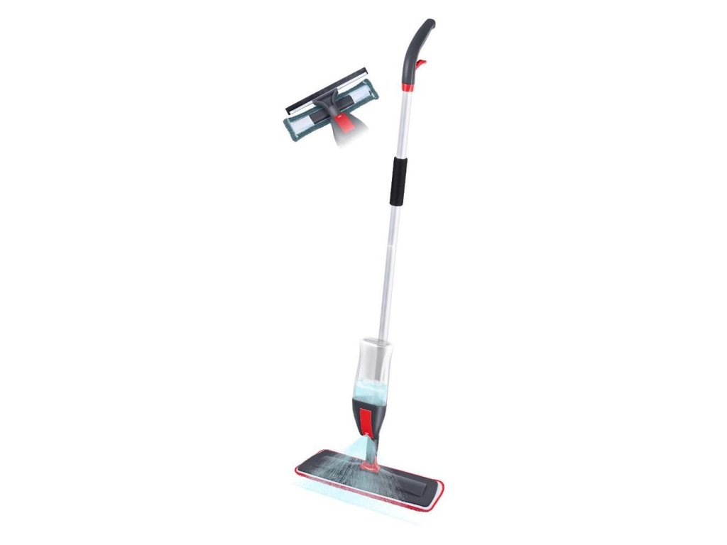 Plochý mop so sprejovou nádržkou a výmennou dvojitou stierkou.