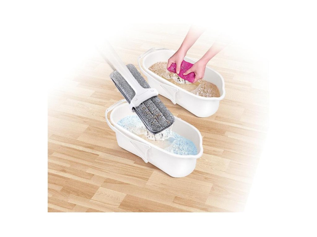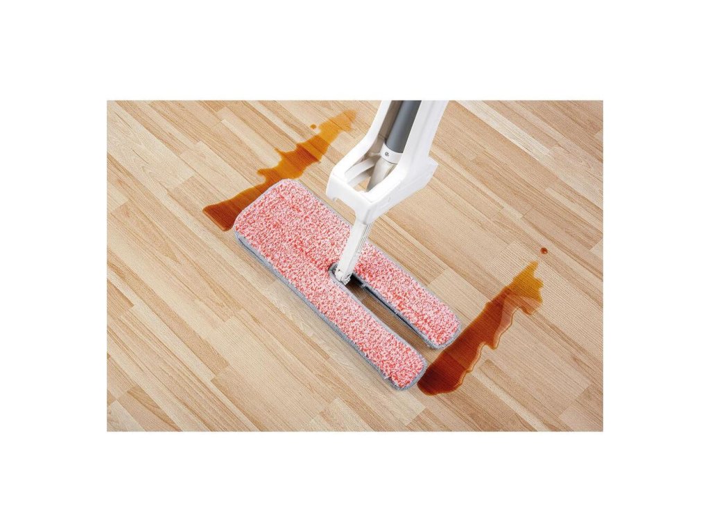 Dvojité mikrovlákno je rozložené na stranu pre hrubé drhnutie nečistôt a druhé pre jemné, klasické čistenie podláh.