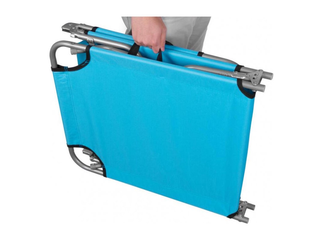 Modré lehátko je určené pre umiestnenie vo vonkajších priestoroch. Konštrukcia lehátka je kvôli pevnosti vyrobená z kovu, s priemerom 22 x 1 mm. Zvyšná časť, určená pre ležanie, je pokrytá odolným textilenom. Celkovo poskytuje lehátko nosnosť 120 kg. Lehátko je polohovateľné, pomocou troch západok na zadnej strane konštrukcie. Je možné nastaviť polohu pre sedenie, sedenie v miernom záklone alebo pre ležanie. Rozmery lehátka sú 188 x 55 x 27 cm.
