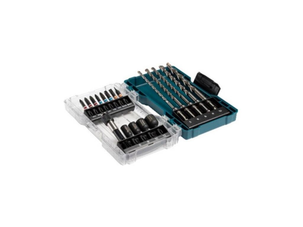 Bity 50 mm: PH1; PH2 x 2 ks; PZ1; PZ2; PZ3; SL5,5;T30; SL0.8 x 5.5; SL1.2 x 6.5 Nástrčný kľúč magnetický 48 mm: 6; 8; 10; 12 Vrták do betónu SDS-PLUS 160 mm: Priemer mm 5; 6 x 2 ks; 8; 10 Magnetický držiak bitov Quick systém 80 mm