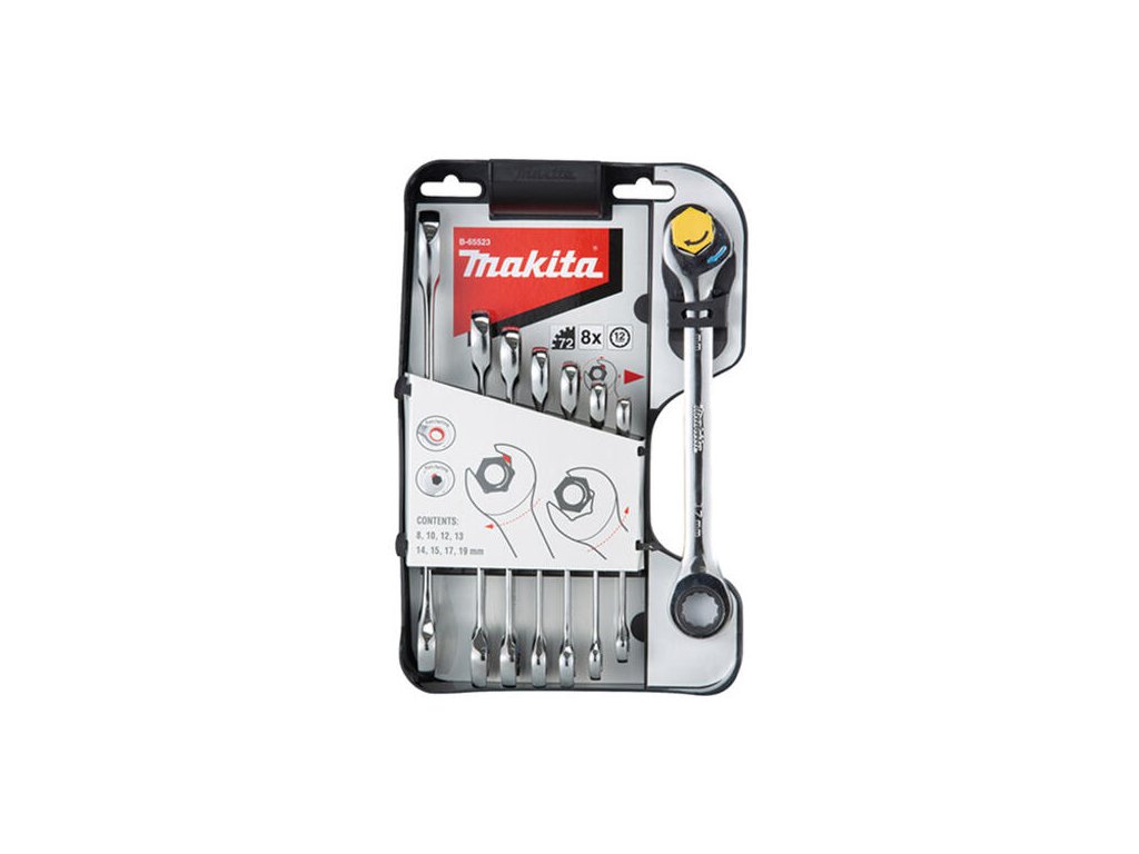 Makita B-65523 je 8-dielna sada kombinovaných kľúčov, ktorá výrazne zrýchľuje prácu vďaka račňovému mechanizmu integrovanému v očkovej časti. Kľúče sú ideálne pre rýchle a efektívne uťahovanie a povoľovanie skrutiek a matíc aj v obmedzených priestoroch. Sada je vyrobená z vysoko kvalitného materiálu a pokrýva najpoužívanejšie rozmery od 8 do 19 mm.