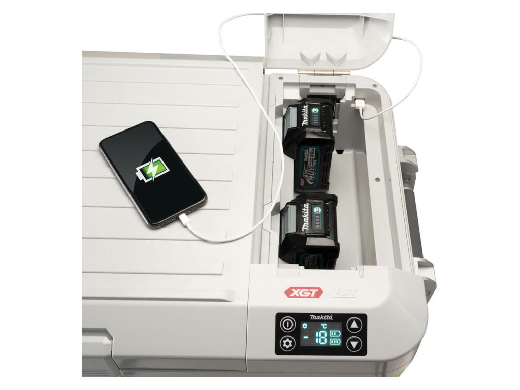 - Napájanie cez jednu batériu LXT 18V alebo XGT 40 Vmax (jedna samostatná alebo dve paralelne), 12V / 24V DC (pripojenie cez autozásuvku, kábel súčasťou dodávky) alebo sieťové napájanie (voliteľné)