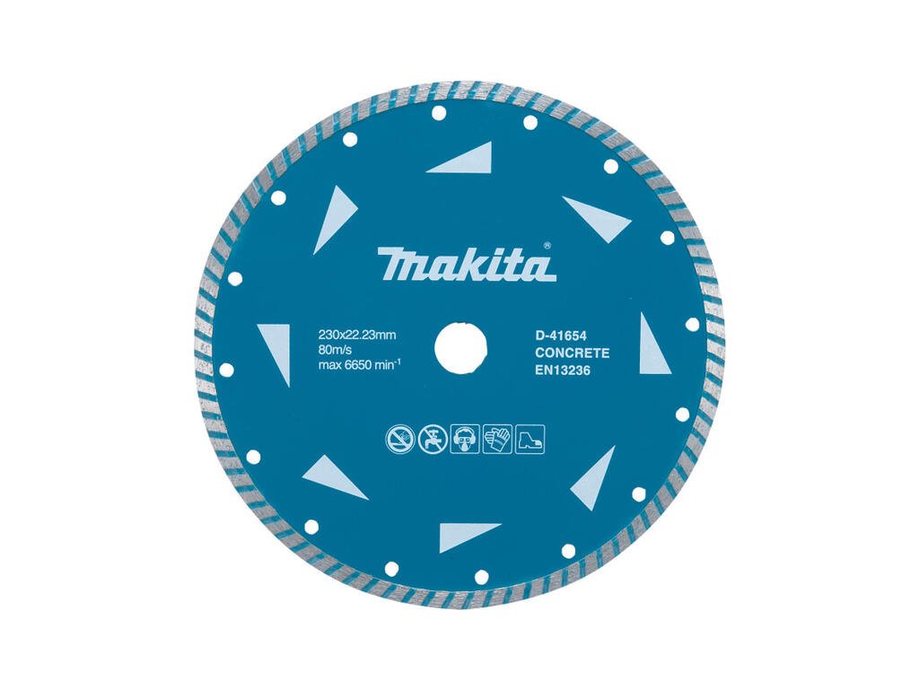 Makita D-41654 je robustný nedelený diamantový rezný kotúč (turbo) s priemerom 230 mm, špeciálne určený pre náročné práce a suché rezanie betónu, kameňa, dlaždíc a iných stavebných materiálov. Vejárovitá hrana (turbo segment) zaisťuje rýchly rez a efektívny odvod materiálu.