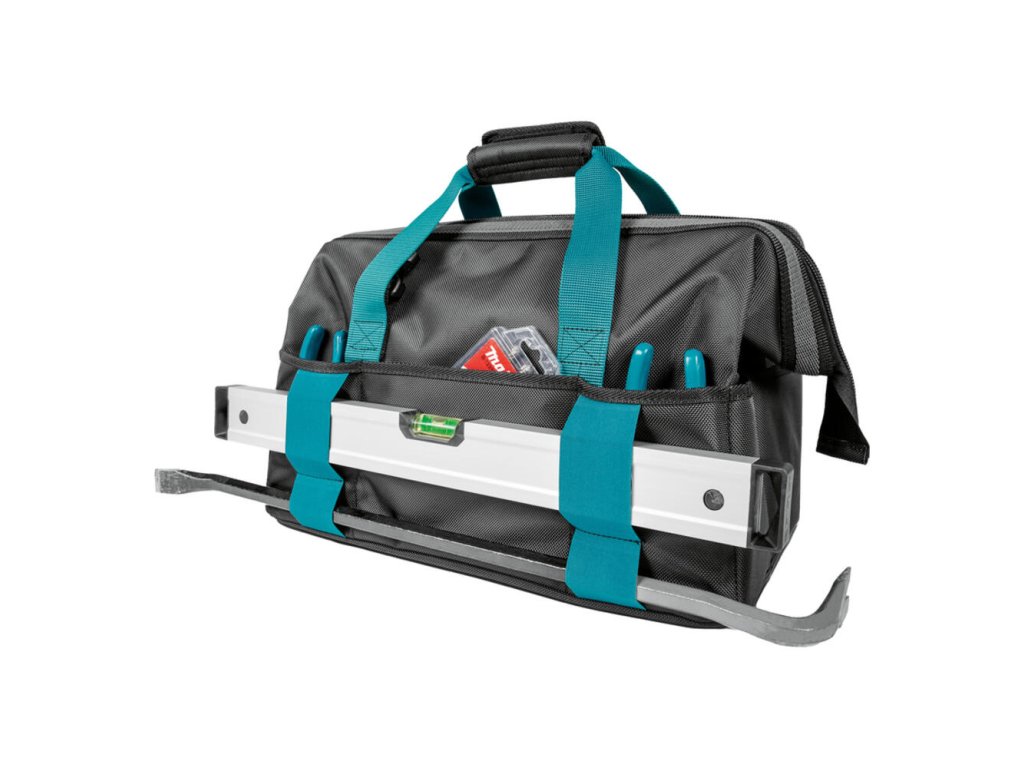 - Detaily: D-krúžok slúži na pripevnenie náradia pomocou karabín. Taška má dlhé polypropylénové pútka na ruky a viditeľné logo Makita.