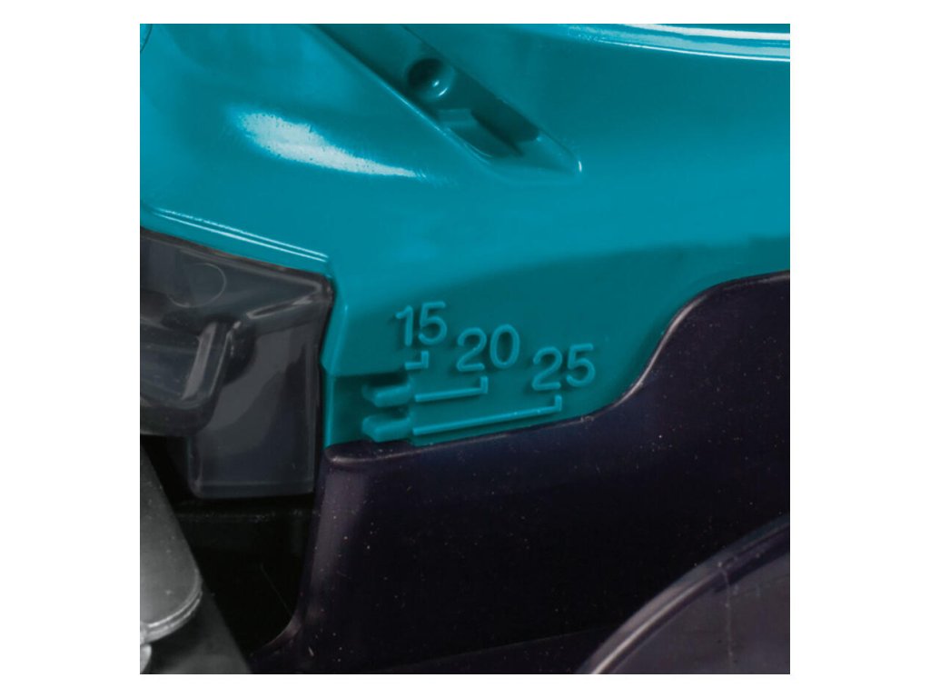 - Jeden nástroj, dve funkcie: stroj je dodávaný s dvoma ľahko zameniteľnými nožovými súpravami, jednou pre vrchné orezávanie (postranné kosiace nože 20 cm dlhé) a druhou pre rezanie okrajov trávy (predné kosiace nože široké 16 cm).